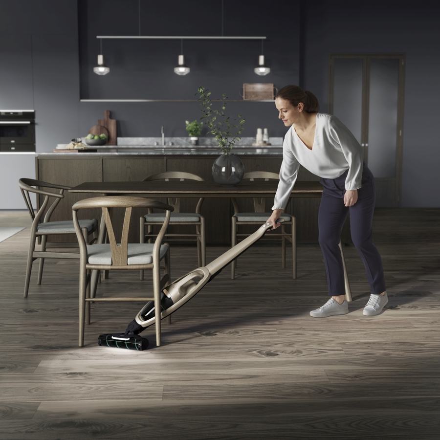 Door het lagere zwaartepunt met de motorunit aan de onderzijde van de stofzuiger ligt de stofzuiger lichter in de hand en zorgt zo voor een gevoel van moeiteloos schoonmaken. Het dubbele handvat van de handstofzuiger staat garant voor een moeiteloos zuigen van andere hoger gelegen oppervlakken. Dankzij het volledige kantelbare slanke design, past de stofzuiger onder meubels met een hoogte vanaf de vloer van 135 mm. De stofzuiger heeft een ergonomische grip zodat deze altijd perfect in de hand ligt.