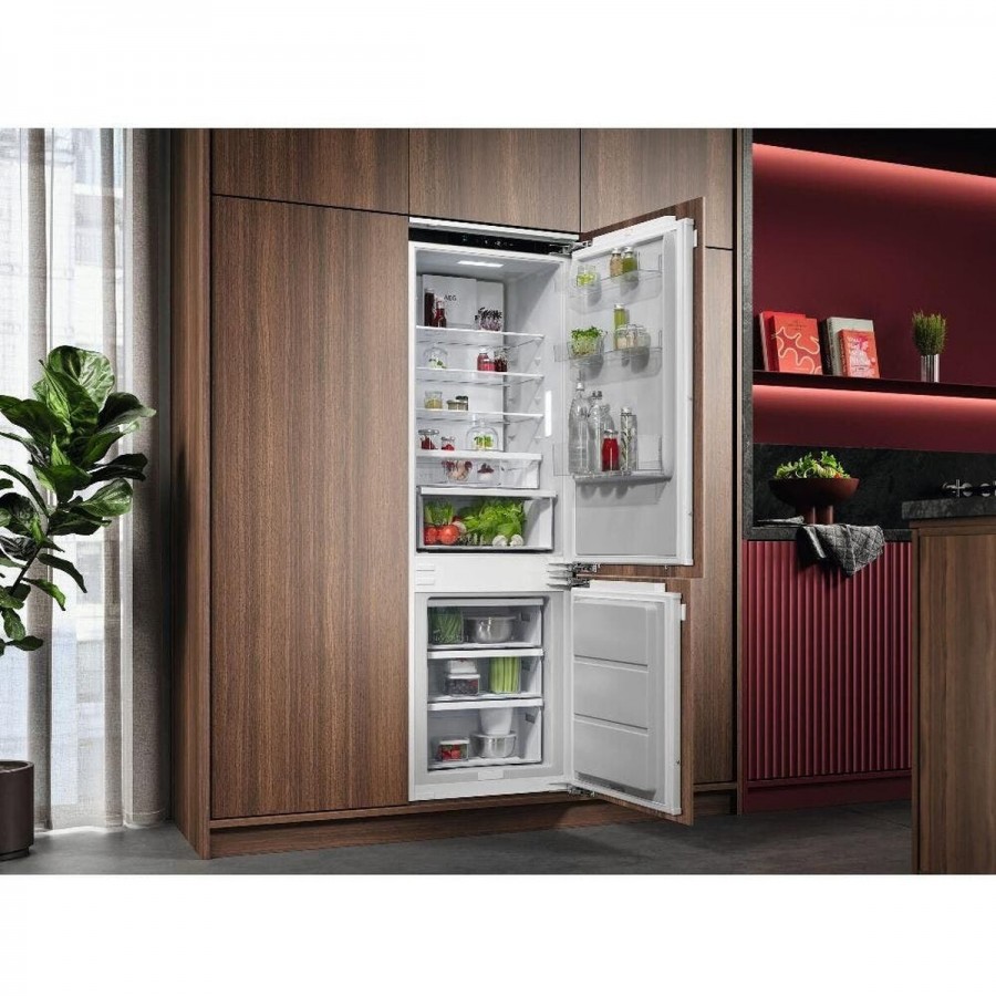 Deze AEG TC7MS181CF inbouw koel-vriescombinatie brengt innovatie en duurzaamheid perfect in balans. Dankzij de revolutionaire GreenZone+ technologie blijven uw groenten en fruit langer vers door een geoptimaliseerde vochtigheidsgraad, wat zorgt voor een indrukwekkend vitaminebehoud. Het geavanceerde Twintech NoFrost systeem garandeert een vorstvrije vriezer en voorkomt uitdroging in de koelkast. Bovendien is het interieur voor 70% gemaakt van gerecycled plastic, wat een belangrijke bijdrage levert aan een circulaire economie en afvalreductie. De MultiFlow technologie handhaaft een uitzonderlijk stabiel klimaat in de gehele koelkast.