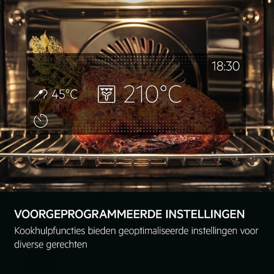 Deze AEG TK8NK621B inbouw oven met magnetron combineert op ingenieuze wijze de kracht van een heteluchtoven met geavanceerde magnetrontechnologie, waardoor u tot wel vijftig procent sneller klaar bent dan met een conventionele oven. Het intuïtieve CookSmart Touch display biedt uitgebreide kookassistentie en begeleidt u stap voor stap bij de bereiding van zowel alledaagse maaltijden als uitgebreide diners. Dankzij de geïntegreerde kerntemperatuursensor bereikt u altijd de perfecte gaarheid, terwijl het slimme heteluchtconvectiesysteem zorgt voor een uitzonderlijk gelijkmatige verdeling van de warmte. Dit resulteert niet alleen in superieure kookresultaten, maar ook in een aanzienlijke energiebesparing, waardoor deze combi-oven de ultieme keuze is voor de moderne keuken.
