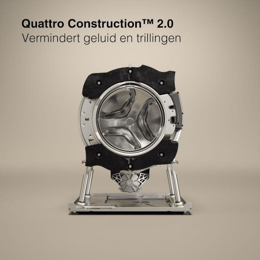 Het geavanceerde dempingssysteem bestaat uit vier schokdempers die trillingen van de trommel gelijkmatig over een versterkte stalen bodemplaat verdelen. Deze constructie, gecombineerd met een robuuste gietijzeren motorbevestiging, minimaliseert beweging en geluid, waardoor de wasmachine uitzonderlijk stil en stabiel blijft, zelfs tijdens het uitwringen van zware ladingen op maximale snelheid.