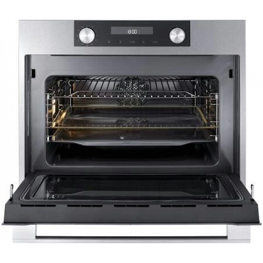 De ovenruimte van 51 liter biedt voldoende ruimte voor het bereiden van meerdere gerechten tegelijk. Dankzij de vier inschuifniveaus kun je verschillende schalen en bakplaten plaatsen, wat ideaal is voor grotere maaltijden of het gelijktijdig bereiden van meerdere gerechten. Bovendien is de oven ontworpen zonder draaiplateau, wat het gebruik van vierkante schalen mogelijk maakt en de ruimte optimaal benut.