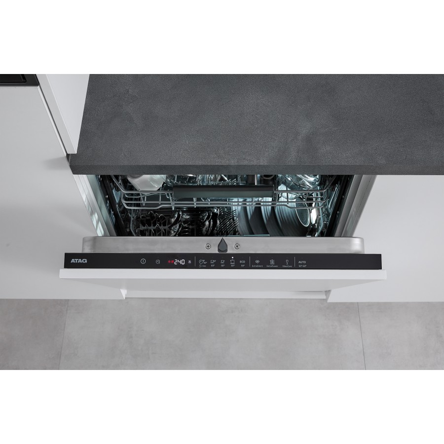 Deze Atag VA6115HT is een volledig geïntegreerde inbouw vaatwasser speciale sleepdeur voor installatie op hoogte of voor een zeer lage plint (min. 2 cm). Deze afwasmachine is uitgevoerd met een extra besteklade bovenin de kuip en een geluidsniveau van 42 dB.