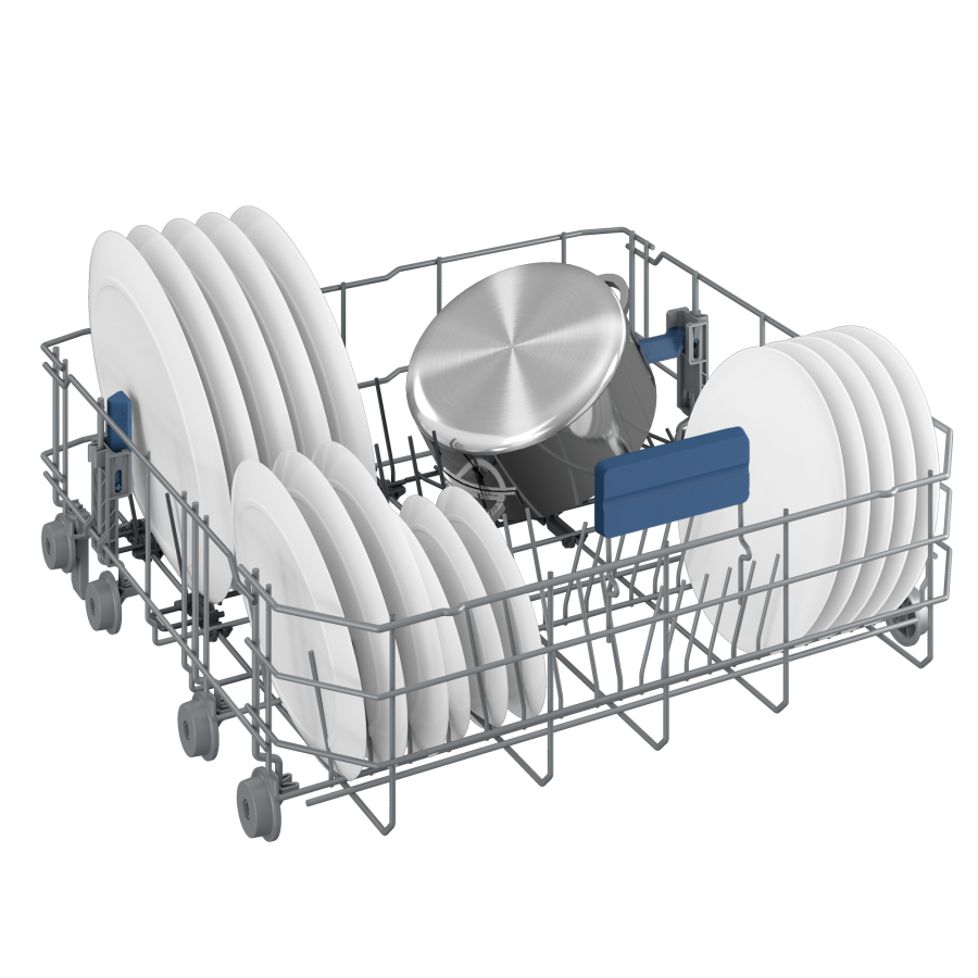De inklapbare steunen in de onderste korf maken het eenvoudig om grote pannen of schalen kwijt te kunnen. Zo pas je de indeling van de vaatwasser moeiteloos aan op wat je nodig hebt, zonder concessies te doen aan ruimte of gemak.