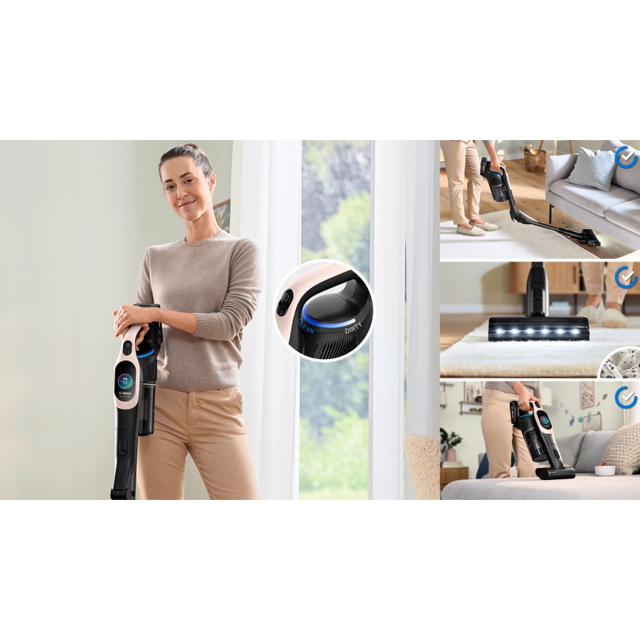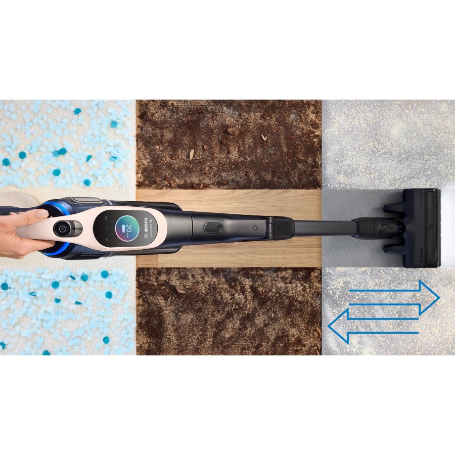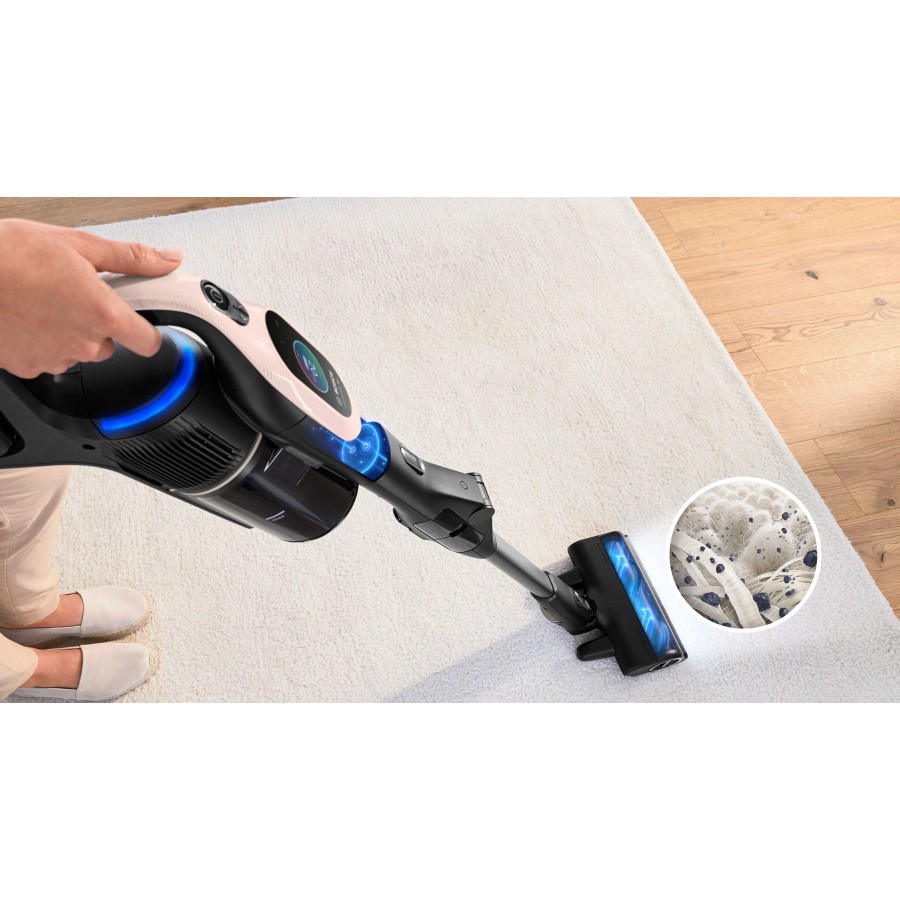 De geïntegreerde lithium-ionbatterij biedt een aanzienlijke gebruiksduur, waardoor u de volledige woonruimte kunt stofzuigen zonder te worden beperkt door een stopcontact of een vervelend snoer dat in de weg zit. Deze ongebonden mobiliteit maakt een efficiëntere en comfortabelere schoonmaakbeurt mogelijk, waarbij u eenvoudig van de ene naar de andere kamer beweegt.