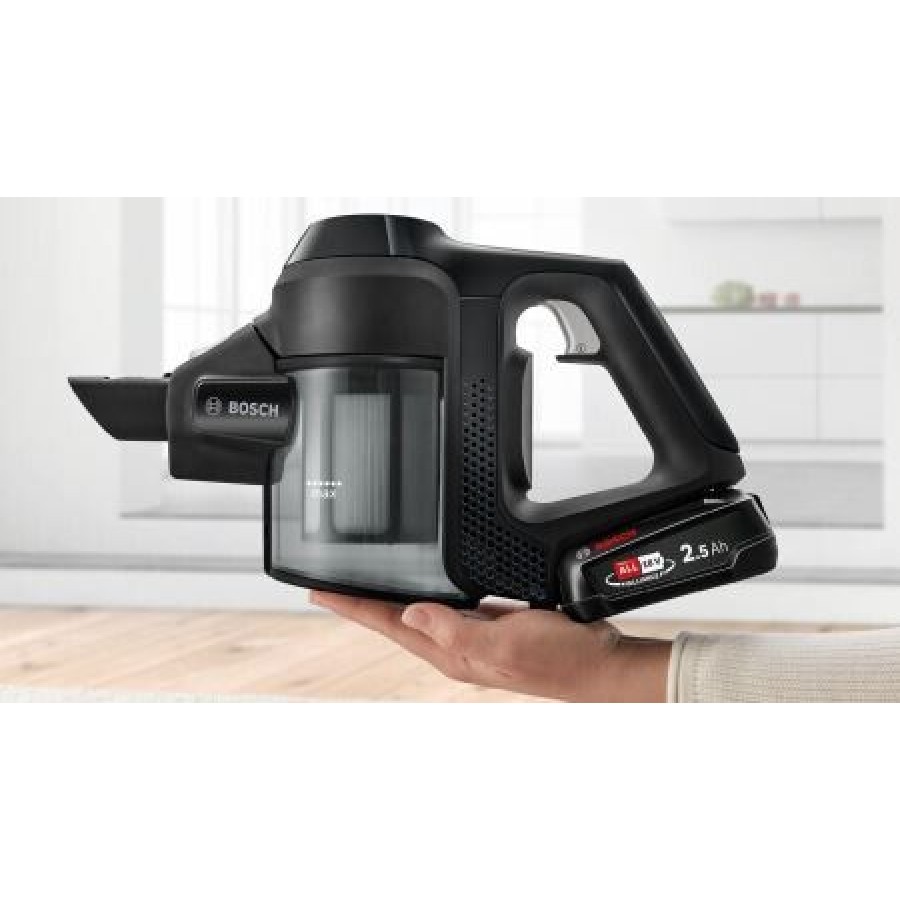 Deze Bosch BBS611BSC steelstofzuiger biedt een ongeëvenaarde reinigingsvrijheid. Dankzij het krachtige 18 volt systeem en een indrukwekkende batterijduur van wel 35 minuten kunt u uw hele huis in één keer stofzuigen. De verwisselbare accu maakt het mogelijk om altijd een volle reserve paraat te hebben, zodat u nooit meer onderbroken wordt. De bijgeleverde wandlader zorgt voor een vaste, opgeruimde opslagplaats en laadt de accu altijd op wanneer deze niet in gebruik is. Deze multifunctionele zuiger combineert kracht, gebruiksgemak en ultieme flexibiliteit voor een perfecte schoonmaakbeleving.