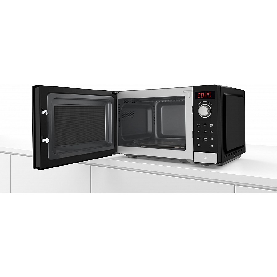 Deze Bosch FFL023MS2 is een vrijstaande magnetron uitgevoerd in het zwart en voorzien van RVS accenten. Dit model is voorzien van een magnetron vermogen van 800 Watt, een inhoud van 20 liter en is eenvoudig te openen door middel van een knop.
