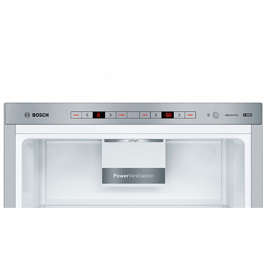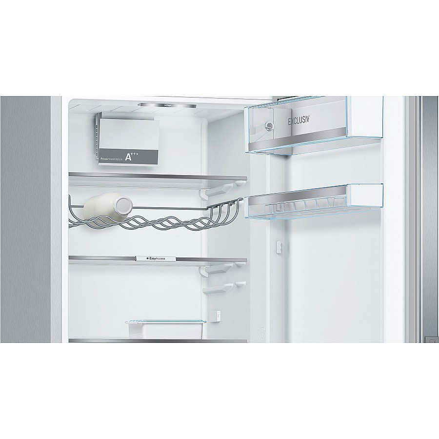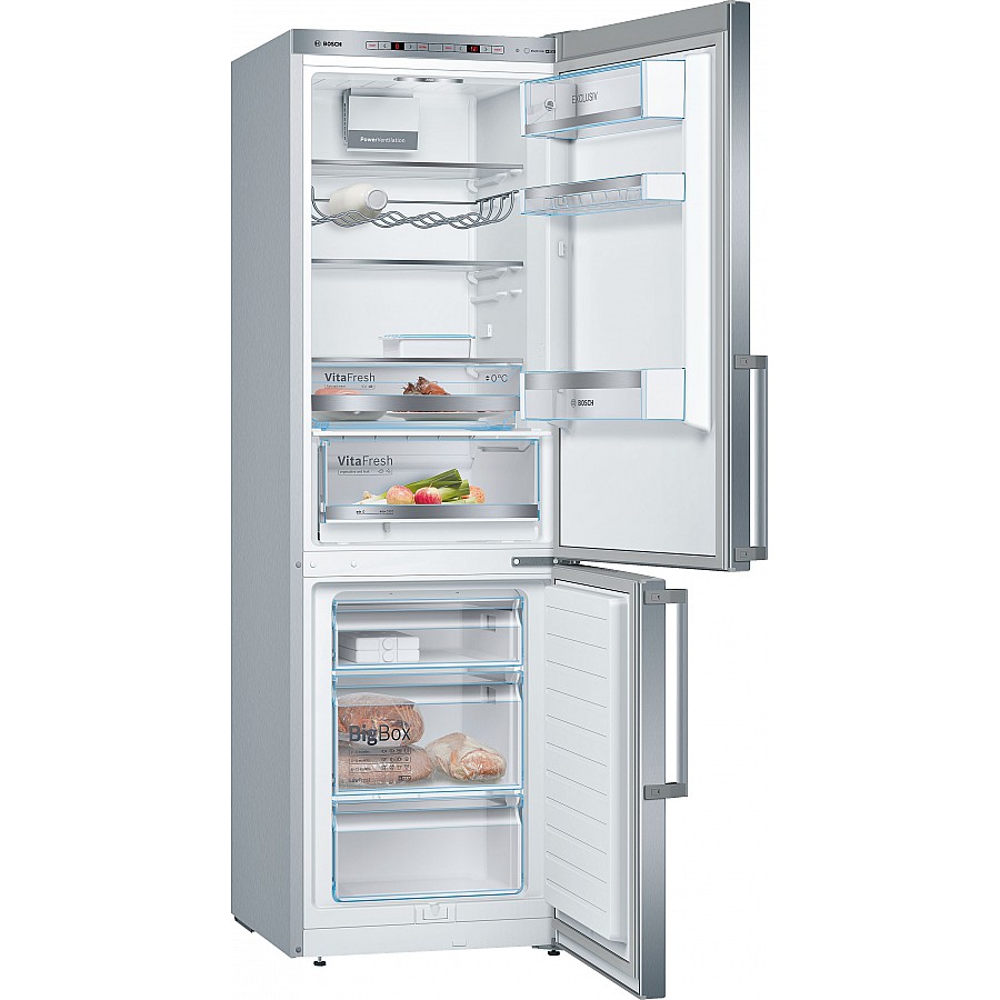 Bewaar groente en fruit langer in de VitaFresh vershoudlade van de Bosch KGE36EICP EXCLUSIV koel-vriescombinatie. Door de instelbare luchtvochtigheidsregeling maakt u de lade geschikt voor groente of fruit. De energiezuinige A+++ koel-vriescombinatie is 186 cm hoog en heeft een laag geluidsniveau van 38 decibel. Zet hem dus gerust in uw open keuken. Het middelste plateau is een EasyAccess plateau. Trek hem volledig naar u toe als u bijvoorbeeld de fles ketchup zoekt. Zonder andere potjes om te stoten pakt u de ketchup moeiteloos. Het vriesgedeelte beschikt over LowFrost wat betekent dat u het vriesgedeelte 1 á 2 keer per jaar moet ontdooien. Zonder ijs blijft de koel-vriescombinatie energiezuinig in gebruik.