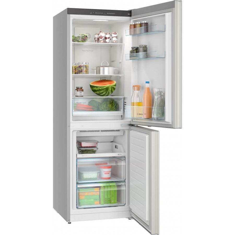 Deze Bosch KGN33NSDB vrijstaande koel-vriescombinatie biedt een perfecte balans tussen geavanceerde technologie en praktisch gemak. Het innovatieve NoFrost systeem zorgt ervoor dat u de vriezer nooit meer handmatig hoeft te ontdooien, wat tijd en moeite bespaart. Uw groenten en fruit blijven langer vers en knapperig in de speciale, gegolfde MultiBox lades die de luchtvochtigheid optimaal reguleren. Dankzij de geavanceerde FreshSense technologie worden temperatuurschommelingen effectief tegengegaan voor een constante en betrouwbare koeling. Bovendien past het apparaat zich automatisch aan de omgevingstemperatuur aan, zodat de prestaties altijd optimaal zijn ongeacht de seizoenen.