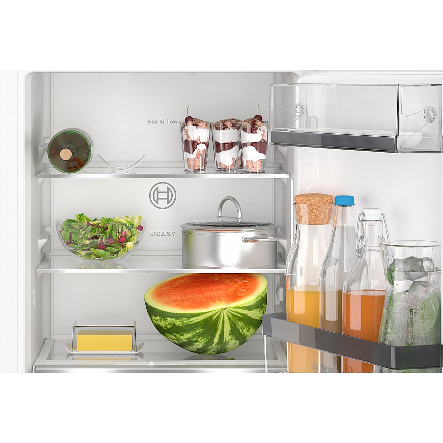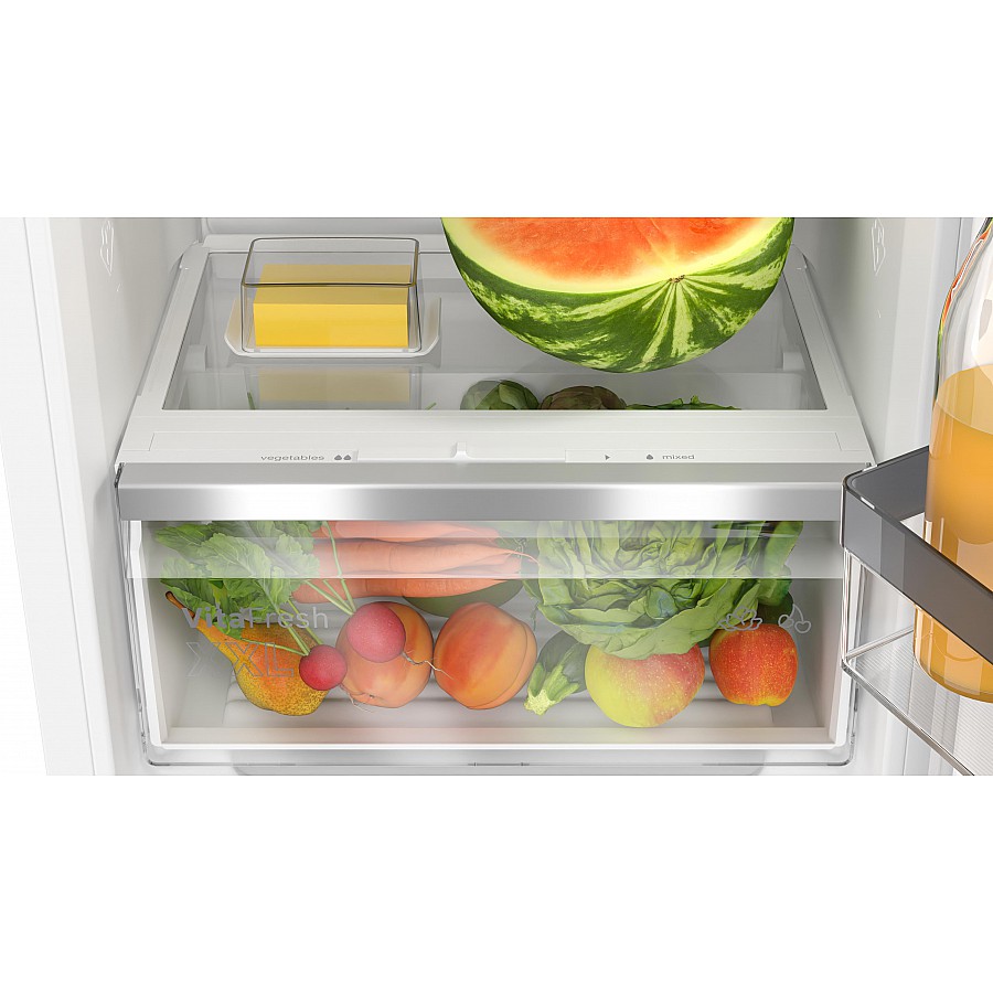 Deze Bosch KIR21EDD1 is een inbouw koelkast met een netto inhoud van 136 liter. De koelkast heeft energieklasse D, een nishoogte van 88 cm en een gebruiksvriendelijk softclosing deur-op-deur systeem. KIR21EDD1 de VitaFresh lade blijven groente en fruit tot wel 3 keer langer vers dankzij een instelbare luchtvochtigheid en flessen bergt u op in het flessenrek. Daarnaast zorgt FreshSense voor een constante koeltemperatuur, voor een betere versheid en een constante smaak.