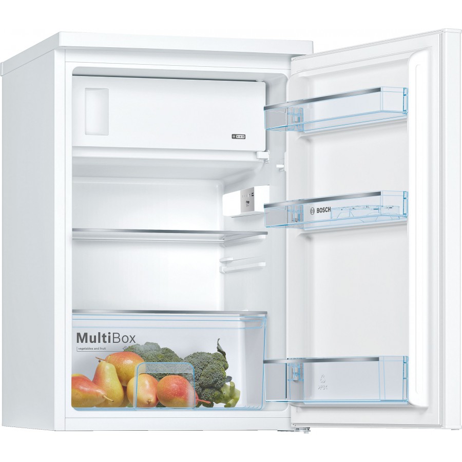 Deze Bosch KTL15NWEA vrijstaande tafelmodel koelkast heeft een totale netto inhoud van 120 liter, waarvan 14 liter voor het interne vriesvak. De koelkast heeft een E energielabel en een geluidsniveau van 39 dB. Het koelgedeelte wordt verlicht met helder, energiezuinige LED verlichting.