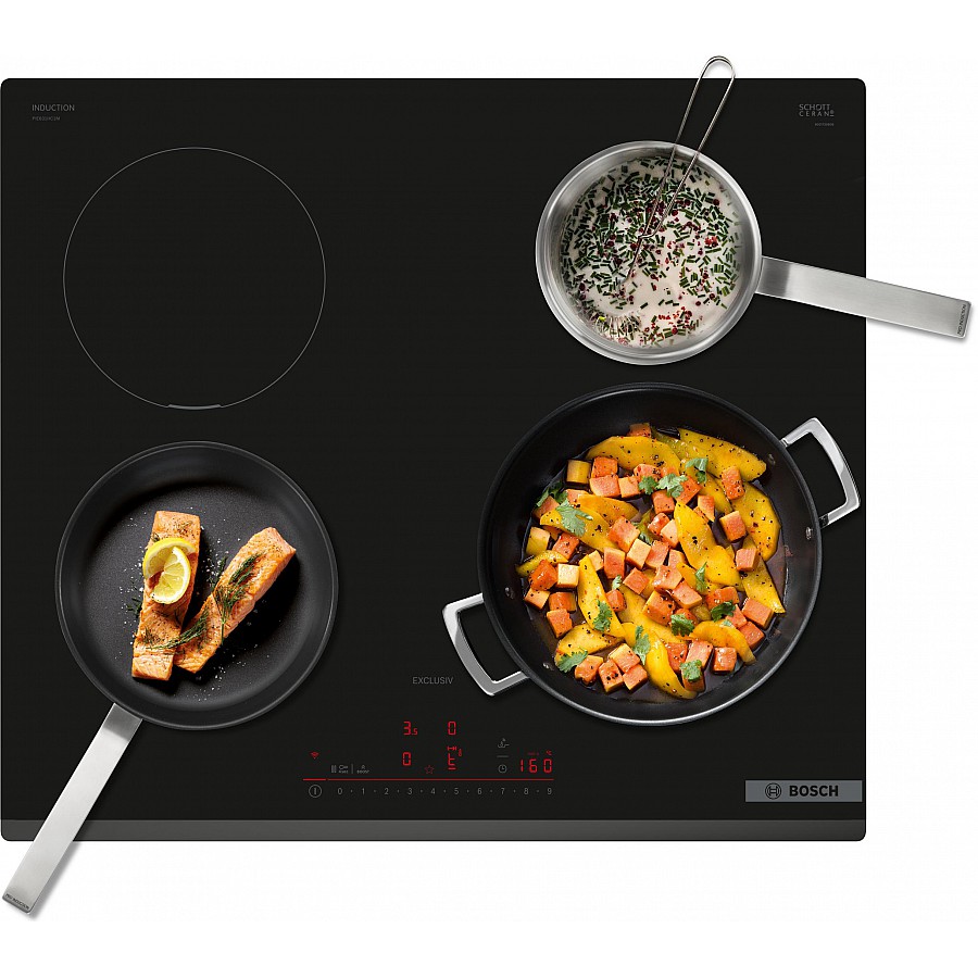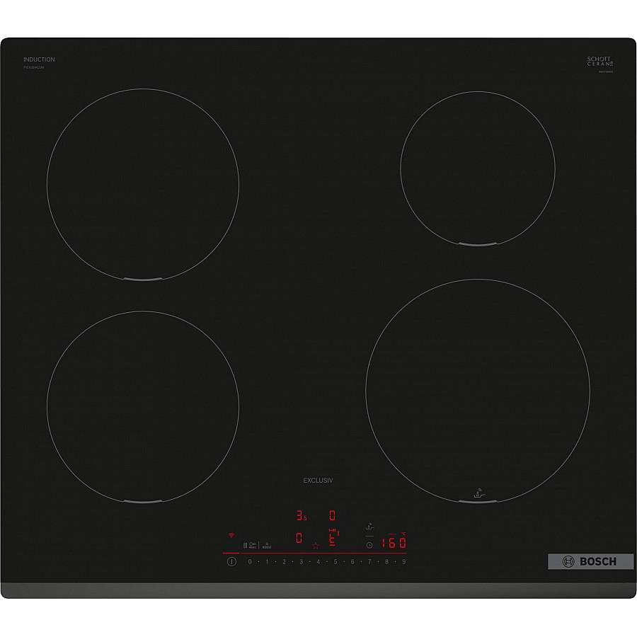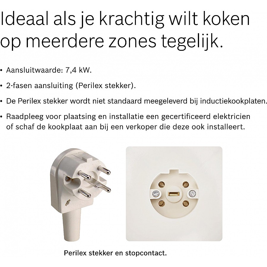 Deze Bosch PIE631HC1M inductie kookplaat beschikt over 4 kookzones. De fraaie Bosch kookplaat heeft een breedte van 60 cm. Koken op inductie is de meest comfortabele en energie efficiënte manier van eten bereiden. Inductie kookplaten vragen een elektrische aansluiting. Deze kookplaat heeft een aansluitwaarde van 7400 Watt.