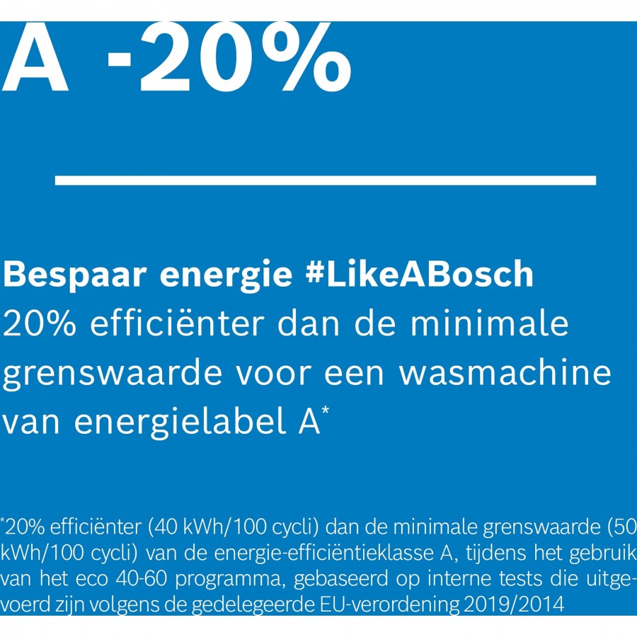De machine behaalt een A-20% energie-efficiëntieklasse door geavanceerde verwarmingselementen en een optimale watercirculatie. Gecombineerd met ActiveWater Plus, dat via sensoren de belading detecteert en de waterhoeveelheid hierop aanpast, wordt er bij elke wasbeurt zo efficiënt mogelijk omgegaan met energie en water, wat leidt tot aanzienlijke besparingen op je rekeningen.