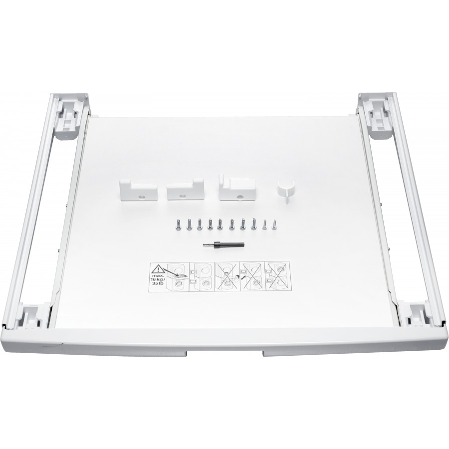 Deze Bosch WTZ11400 verbindingsset voor droger en wasmachine met uitschuifbaar plateau biedt een veilige en ruimtebesparende stapeloplossing, inclusief een handige uittrekbare plank voor gemakkelijk laden en een robuust ontwerp geschikt voor grotere apparaten.
