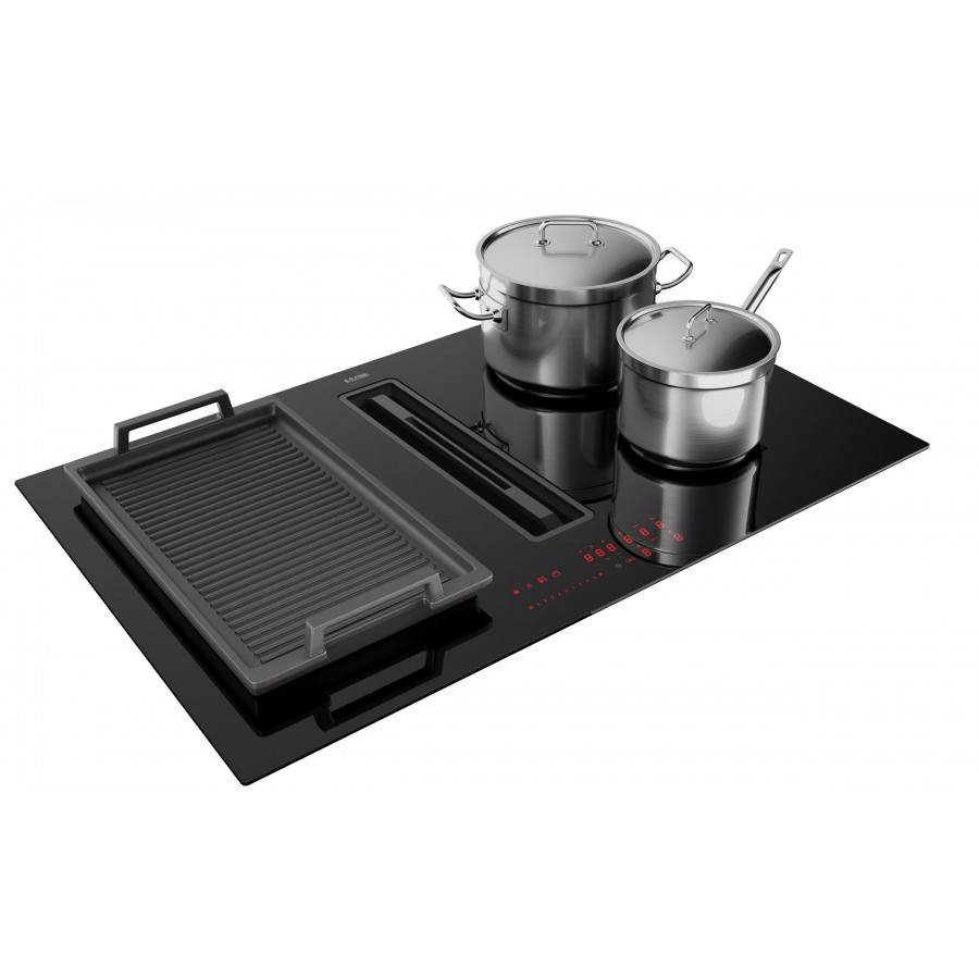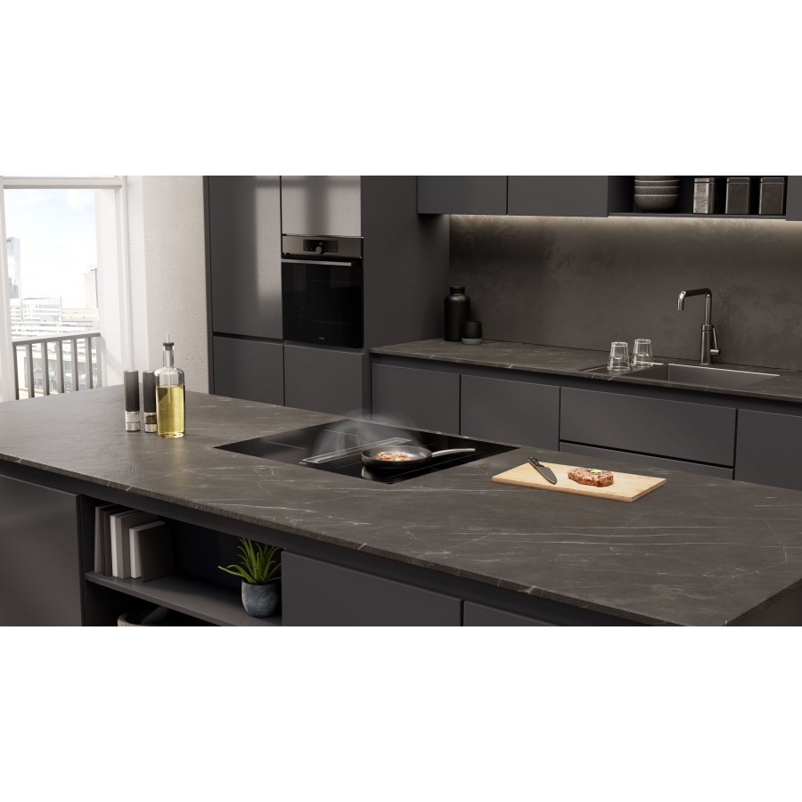 Met een breedte van 80 cm en een hoogte van slechts 21 cm past deze inductiekookplaat met afzuiging moeiteloos in moderne keukens. De subtiele kookzone-aanduidingen en het gestroomlijnde rooster geven het geheel een elegante uitstraling. Geschikt voor werkbladen van 10 tot 50 mm en aan te sluiten op 1- of 2-fase dankzij het slimme powermanagement.