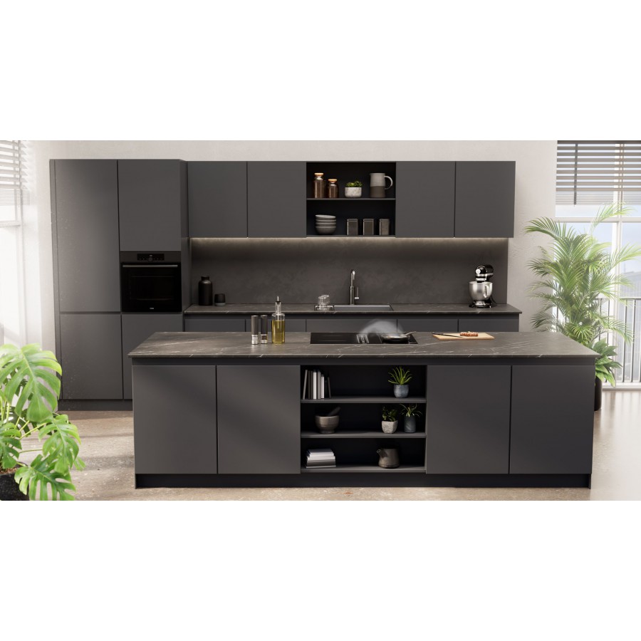 De geïntegreerde afzuigunit biedt 10 standen, inclusief een krachtige boostfunctie tot 570 m³/h. Zelfs op laag vermogen werkt het systeem fluisterstil met slechts 39 dB(A). De combi-filters (vet en geur) zijn eenvoudig uitneembaar en vaatwasserbestendig. Zo blijft je keuken fris én onderhoudsvriendelijk. Kies je voor recirculatie, dan zijn de filters gemakkelijk schoon te houden en vervangbaar indien nodig.