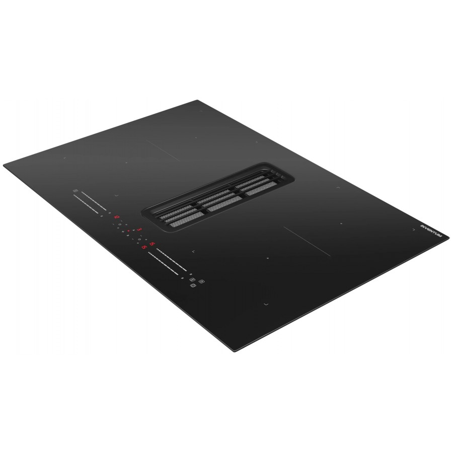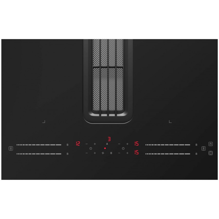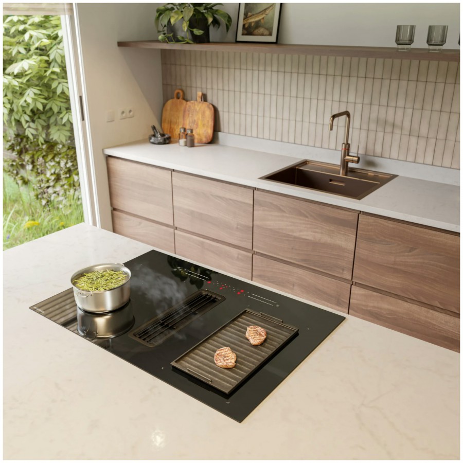 De kookplaat is gemaakt van duurzaam keramisch glas met afgeronde randen en een breedte van 80 cm, wat hem perfect maakt voor een ruime keuken. Met een minimale nisbreedte van 75 cm past hij eenvoudig in je keukenblad. De geïntegreerde afzuiging en roestvrijstalen vetfilters zorgen voor een efficiënte kookervaring zonder geuren of vet.