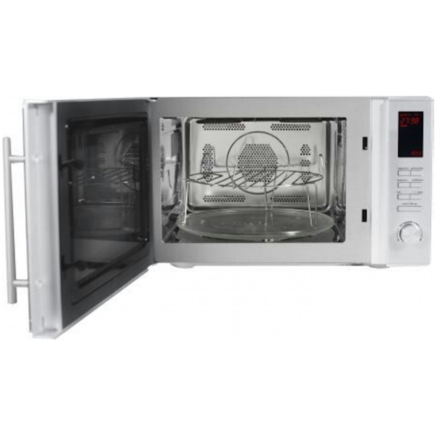 Deze combi magnetron heeft veel mogelijkheden. U kunt gerechten opwarmen in de magnetron en koken, maar met deze combi magnetron kunt u ook grillen en bakken. Er zijn een aantal programma's beschikbaar waarmee u combinatie kunt koken. De functies zijn natuurlijk apart te gebruiken zoals de magnetron, grill en hete lucht functie, maar ze kunnen ook gecombineerd worden. Kies voor magnetron met hete lucht of voor de grill met hete lucht of alle drie tegelijk, magnetron, grill en hete lucht. U heeft met deze combi magnetron geen aparte oven meer nodig. De handige klokfunctie en kookwekker zitten er ook standaard op.