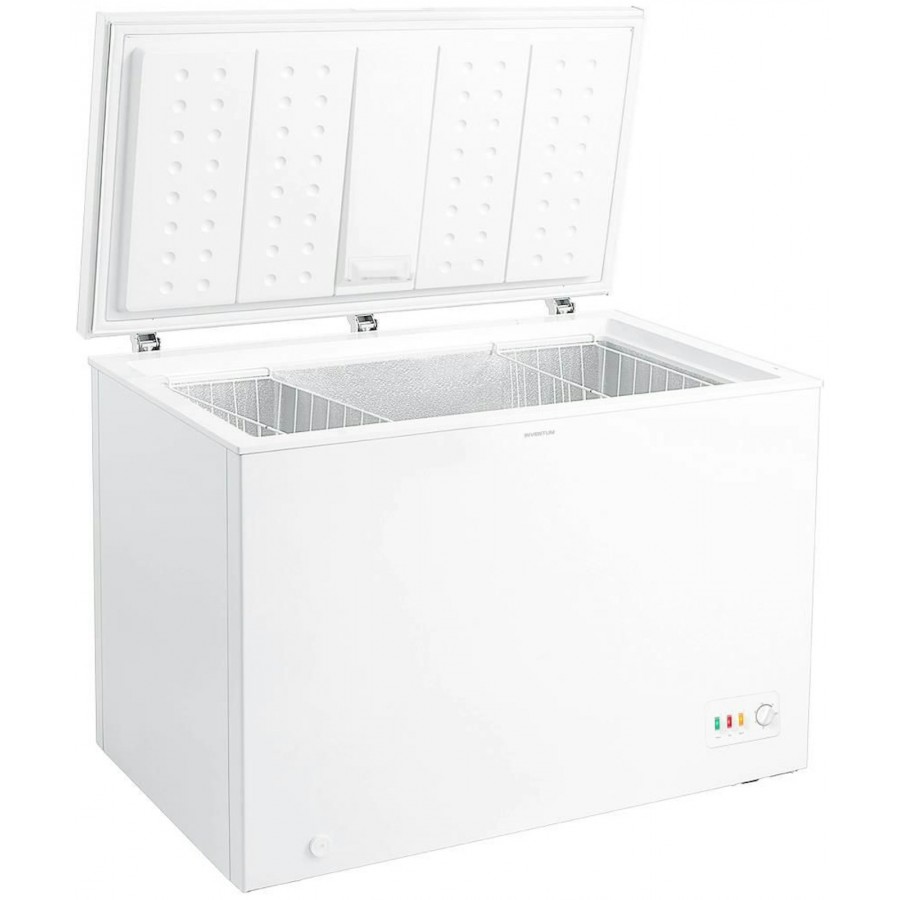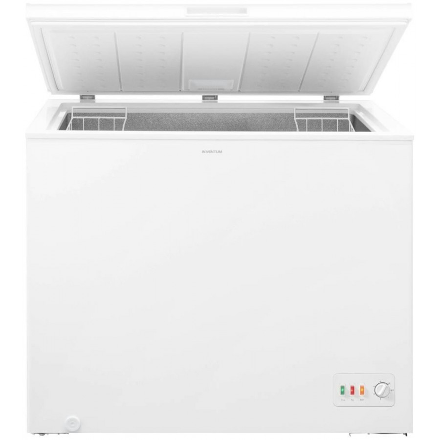 De Inventum vrijstaande vrieskist VK1285W heeft een inhoud 300 liter. Het 4-sterren apparaat heeft een invriesvermogen van 13,5 kg/24u en energieklasse C. Dankzij de luxe led-verlichting heb je goed zicht op de hele inhoud. Bewaar kleinere ingevroren etenswaren in de 2 uitneembare opbergkorven. Dan kun je ze niet over het hoofd zien en gemakkelijk pakken. De thermostaat heeft 7 standen. Je kunt daarmee de temperatuur instellen van -12°C tot -28°C. Door de 2 wielen is het apparaat gemakkelijk te verplaatsen en kan zelfs in een ruimte worden gezet tot -15°C, zoals een garage. Ontdooien van de vrieskist gaat eenvoudig door de handige dooiwaterafvoer en de meegeleverde ijsschraper.
