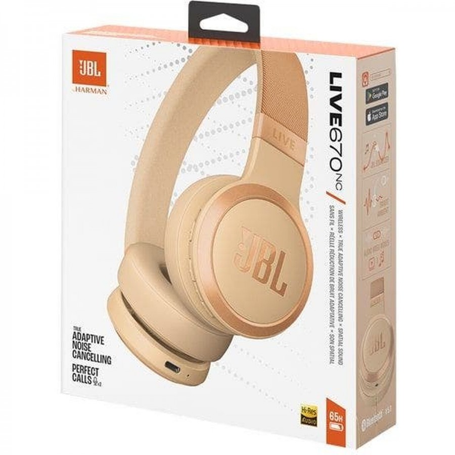 Deze JBL Live 670NC Beige on-ear hoofdtelefoon biedt adaptieve ruisonderdrukking, een indrukwekkende batterijduur van maximaal 65 uur, persoonlijke geluidsoptimalisatie via JBL Personal Sound en een comfortabel draagbaar on-ear ontwerp in een stijlvolle beige uitvoering voor een superieure luisterervaring.