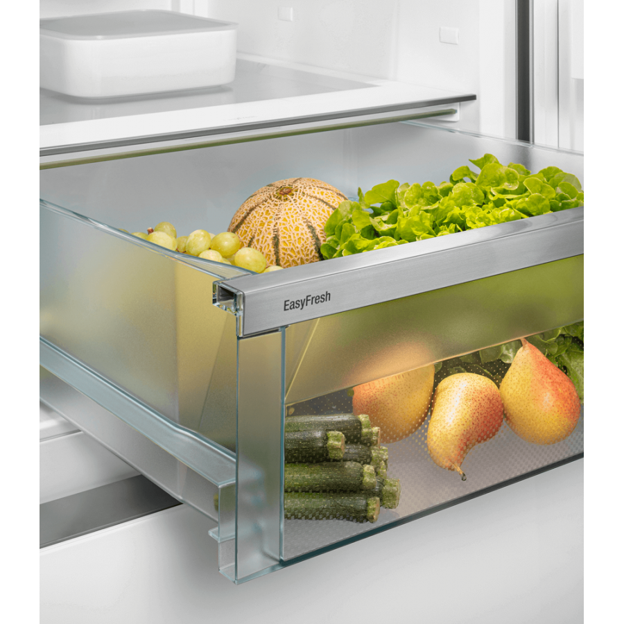 Het koelgedeelte boven is praktisch ingedeeld met in hoogte verstelbare leggers van veiligheidsglas, handige vakken in de binnendeur en een ruime groentelade. Geniet van heldere LED binnenverlichting voor optimaal zicht op al je producten, terwijl het EasyTwist-Ice systeem je voorziet van ijsblokjes met slechts een simpele draai.