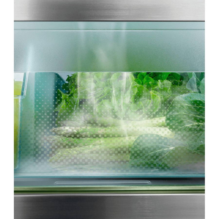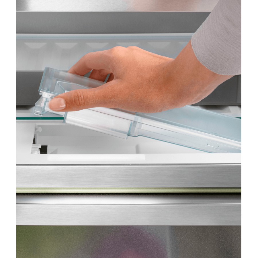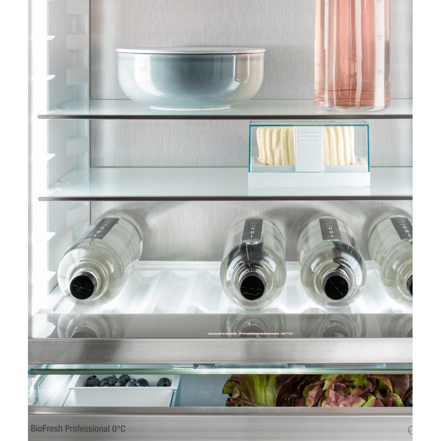 Interieur: Het robuuste SmartSteel interieur met LED wandpanelen en Ambient verlichting heeft een eerste klas uitstraling. De deur met SoftSystem sluit altijd zacht. In de BioFresh Professional laden op SoftTelescopic rails bewaart u groenten en fruit tot 3x langer. De HydroBreeze geeft een frisse nevel over de groente en fruit als dauw over het land. Het NoFrost vriesdeel met LED verlichting hoeft u nooit meer te ontdooien. De IceMaker zorgt voor voldoende voorraad ijsblokjes.