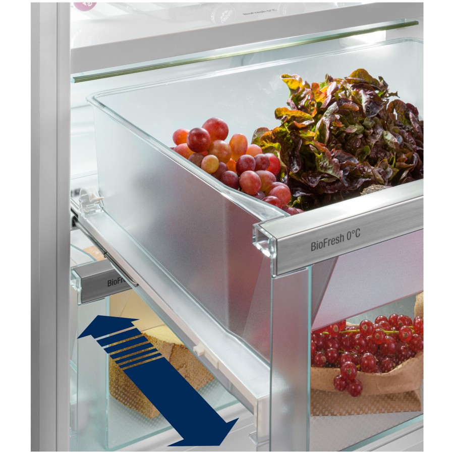 De drie BioFresh laden werken met een nauwkeurig geregeld klimaat, ideaal voor het bewaren van groenten, fruit, vlees en vis. Dankzij de temperatuurregeling rond 0°C blijven voedingsmiddelen aanzienlijk langer vers, wat voedselverspilling vermindert. De laden zijn voorzien van SoftTelescopic rails voor soepele bediening en bieden zelfs ruimte aan grote verpakkingen tot 2 liter.