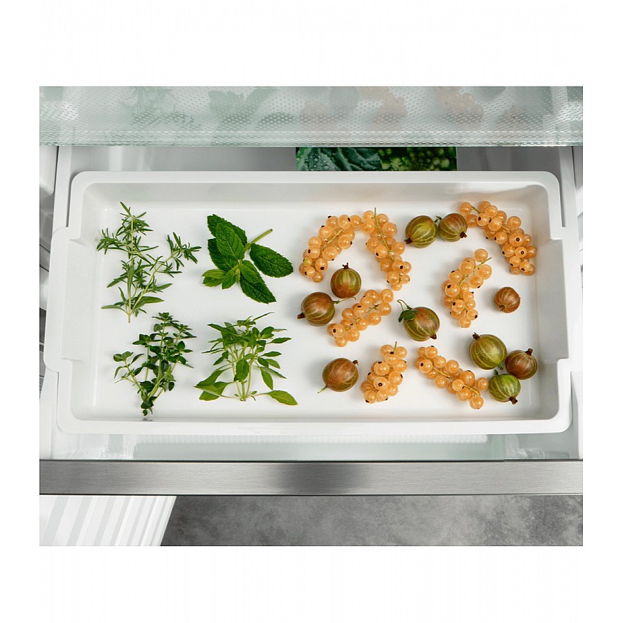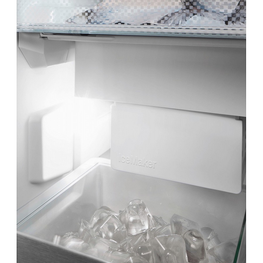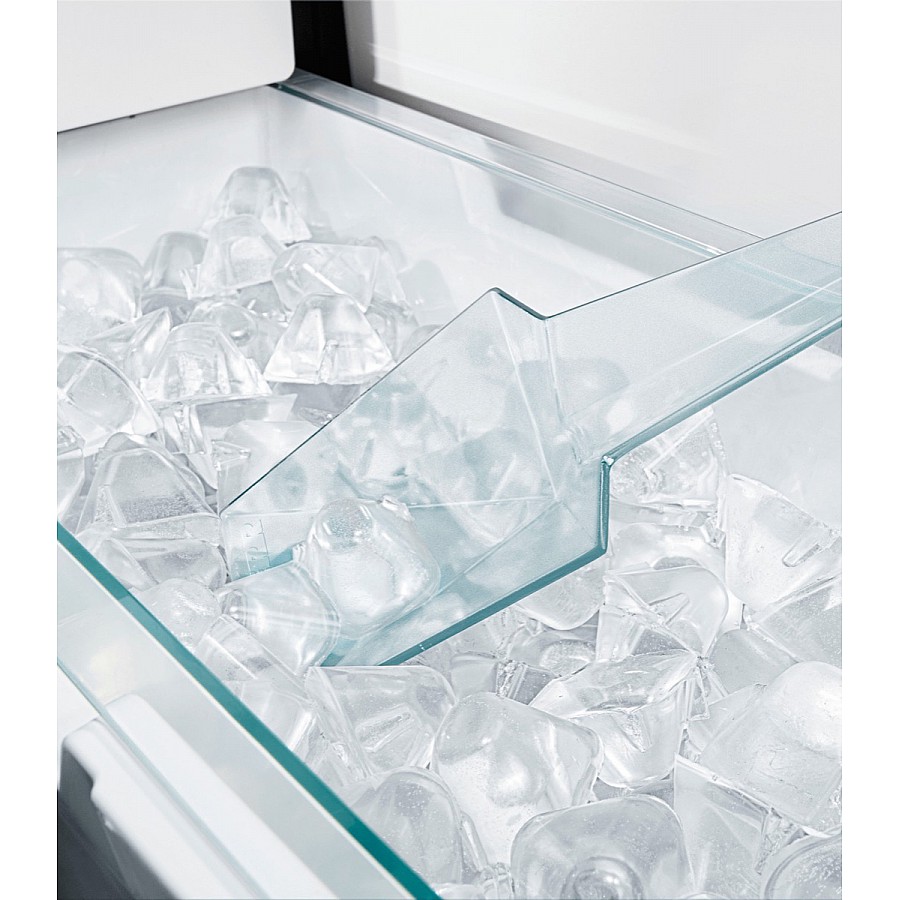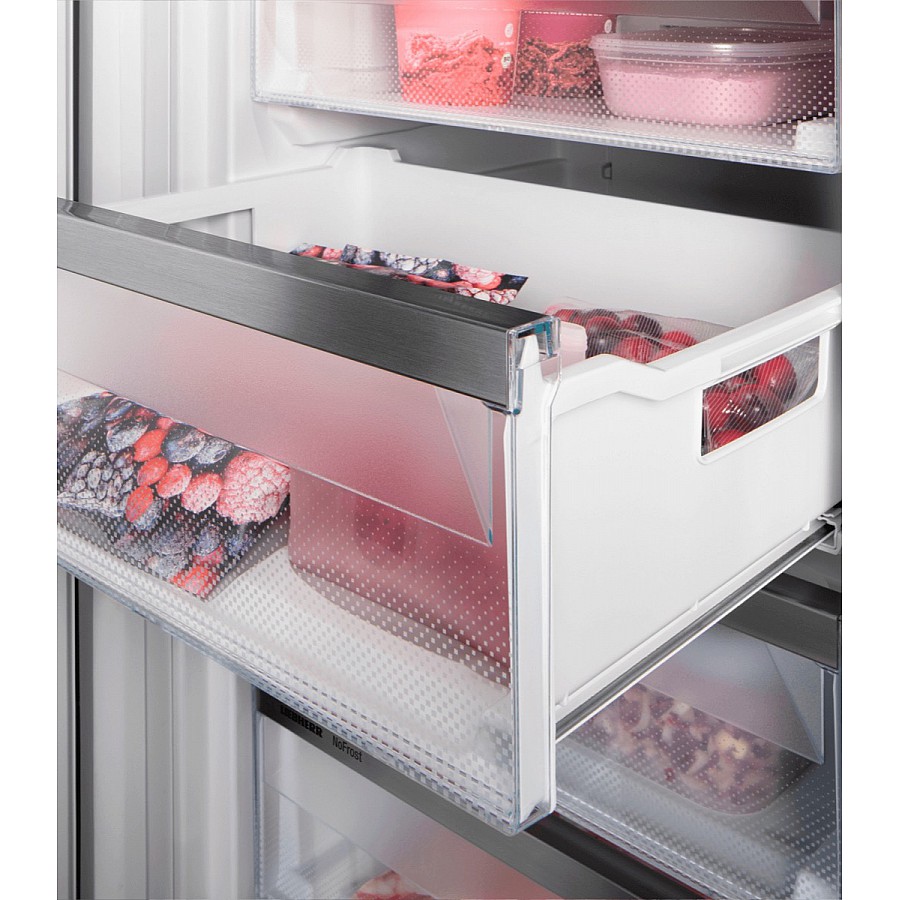 Met het Touch & Swipe kleurendisplay worden alle functies bediend en de goed verlichte telescopische laden kunnen volledig worden uitgetrokken. De uittrekbare IceTower biedt een ijsblokjesvoorraad van 5,7 kilo en wordt dankzij de vaste wateraansluiting continue aangevuld door de ingebouwde IceMaker. De SoftSystem deursluiting zorgt dat de deur altijd zacht sluit en met de warmewand is deze vriezer zonder condensproblemen naast een inbouw koeler of wijnkast te plaatsen. VarioSpace voor extra hoge opbergruimte is standaard en de optionele SmartDeviceBox biedt extra functies zoals de BottleTimer: ontvang een bericht wanneer uw drankfles is afgekoeld. De LED verlichting zorgt voor een goed overzicht in de uitgetrokken laden. De Liebherr vriezer heeft energielabel E en een deur-op-deur scharniersysteem.