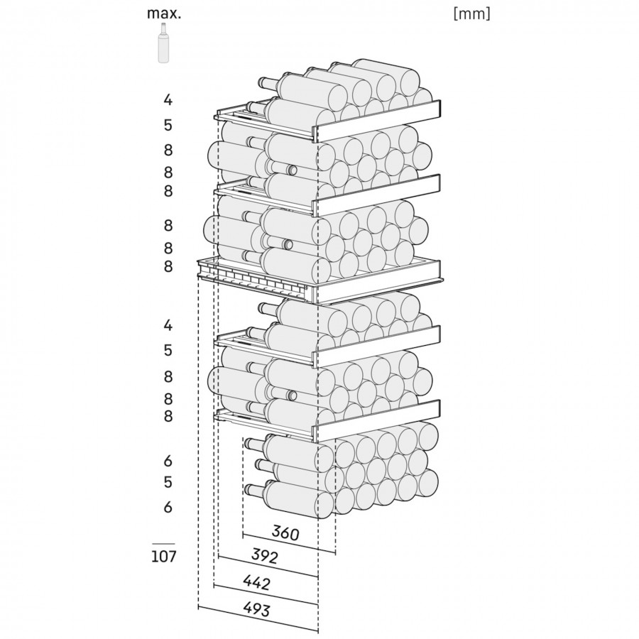 | Aantal flessen op te slaan (0, 75l Bordeaux) | 107 |