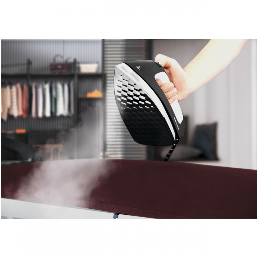 De gepatenteerde honingraatzoolplaat verdeelt stoom gelijkmatig over 348 individuele openingen voor consistente prestatie. Gecombineerd met de innovatieve opblaasfunctie creëert dit systeem een beschermend luchtkussen dat delicate stoffen zoals zijde en kasjmier zwevend behandelt, zonder plooien of naddruk te veroorzaken.