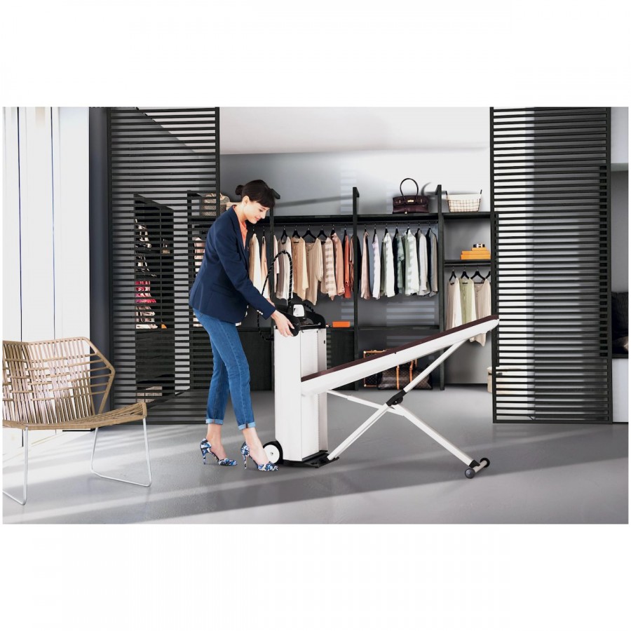 Deze Miele B4826 strijksysteem combineert innovatieve technologie met gebruiksvriendelijkheid voor professionele strijkresultaten. Dankzij het 1-2 liftsysteem is opzetten en opbergen moeiteloos, terwijl de verstelbare hoogte en zwenkwielen extra comfort bieden. De krachtige stoomdruk van 4 bar en constante stoomafgifte van 100 g/min zorgen voor diepe kreukelverwijdering bij alle stofsoorten. De unieke Miele-honingraatzoolplaat garandeert een gelijkmatige stoomverdeling, terwijl de opblaasfunctie delicate materialen zoals kasjmier beschermt. Met een automatische uitschakeling en twee opbergvakken voor accessoires is dit systeem zowel praktisch als energiezuinig.