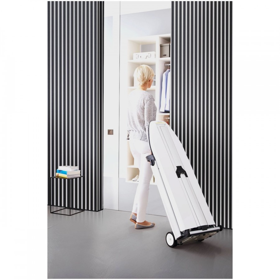 Het intelligente 1-2 liftsysteem transformeert de Miele B4826 van compacte opbergmodus naar volledige werkhoogte met één handbeweging. De hydraulische mechaniek zorgt voor soepele hoogteverstelling tussen 76 en 103 cm, perfect afgestemd op verschillende gebruikers. Dankzij de geïntegreerde zwenkwielen rolt het systeem moeiteloos door elke ruimte.