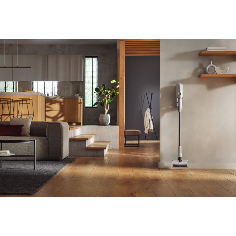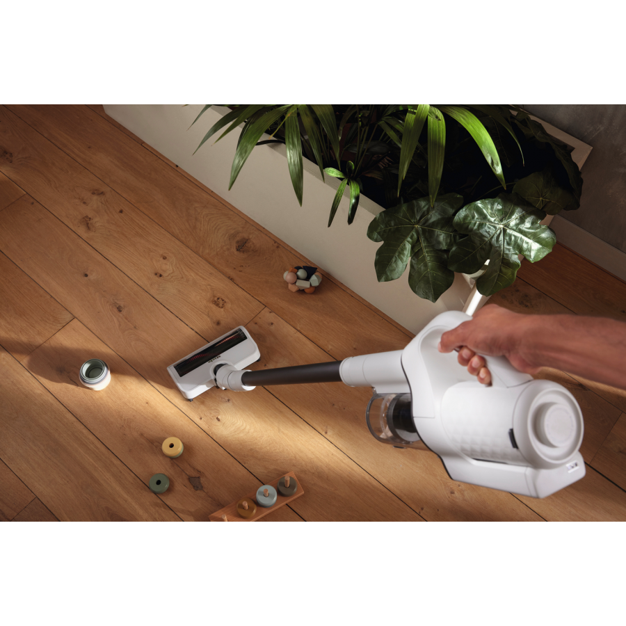 De meegeleverde extra zachte borstel voor harde vloeren beschermt oppervlakken tegen krassen, terwijl de universele meubelborstel zorgt voor een grondige reiniging van stoffen en moeilijk bereikbare hoeken. Het strakke design is niet alleen visueel aantrekkelijk, maar ook functioneel met een handige ophangmogelijkheid voor opbergen en opladen.