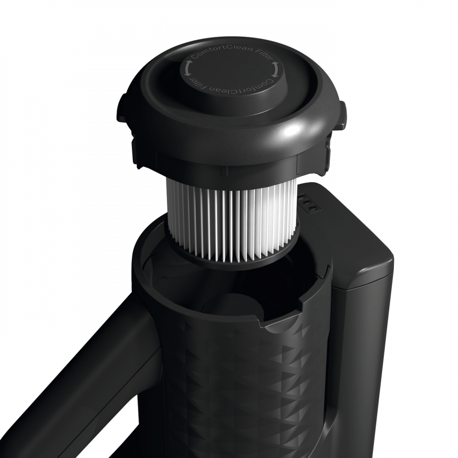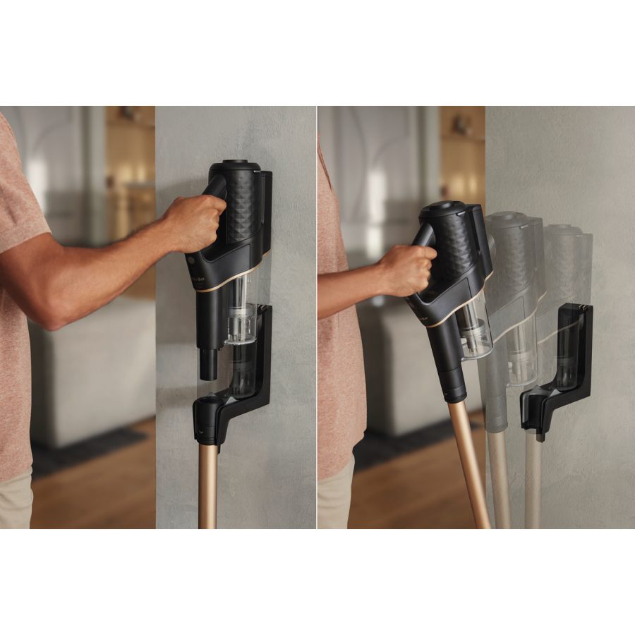 De stofzuiger heeft een strak design en kan eenvoudig worden opgehangen aan de muur, wat ruimte bespaart. Het EasyClean-systeem maakt het legen van het stofreservoir hygiënisch en snel, terwijl de bijgeleverde accessoires, zoals de electro compact handheld brush en de verstelbare zuigmond, zorgen voor een veelzijdige reiniging.
