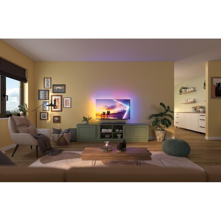 De geïntegreerde Ambilight-LED’s reageren op de schermcontent en projecteren dynamisch licht rondom de TV, waardoor films en games nog meeslepender aanvoelen. Het 4K QLED-scherm met Quantum Dot-technologie zorgt voor een breed kleurbereik en diepe contrasten, waardoor elke HDR-scène tot leven komt met natuurlijke detaillering.