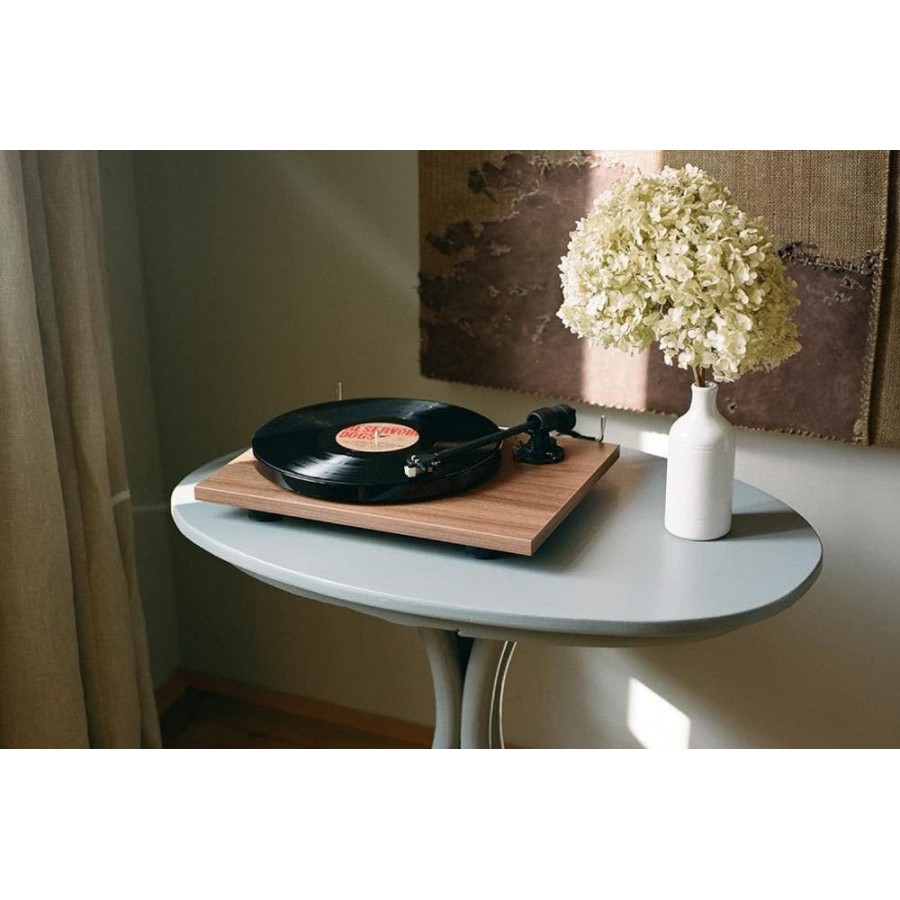 De walnootkleurige behuizing geeft de platenspeler een warme, moderne uitstraling. Bovendien wordt de E1 Phono geleverd met handige accessoires, zoals een acryl stofkap, RCA-kabels, vilten mat en een adapter voor 7-inch platen. Alles wat je nodig hebt voor een complete luisterervaring wordt standaard meegeleverd.