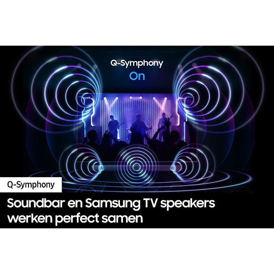 Via Q-Symphony werkt de soundbar perfect samen met de speakers van je Samsung TV, voor een krachtiger en beter gescheiden geluid. En dat alles zonder extra kabels: zelfs via een draadloze WiFi-verbinding blijft de Dolby Atmos-kwaliteit behouden. Bedien alles met één afstandsbediening of via de SmartThings-app.