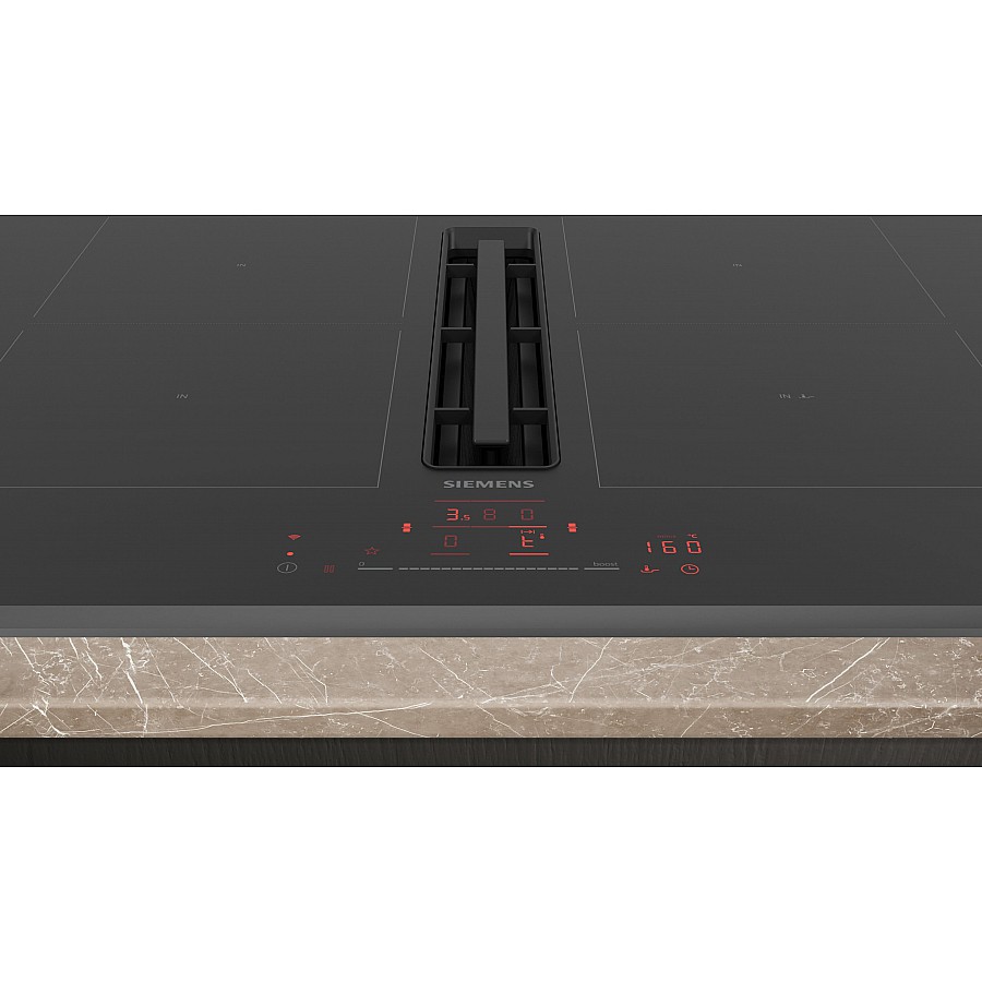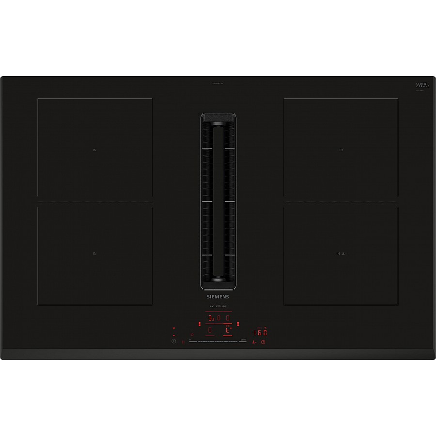 Deze hoogwaardige Siemens ED851HQ26M extraKlasse inductie kookplaat met afzuiging beschikt over 4 kookzones. De stijlvol vormgegeven Siemens kookplaat heeft een breedte van 80 cm. Koken op inductie is de meest comfortabele en energie efficiënte manier van eten bereiden. Inductie kookplaten vragen een elektrische aansluiting. Deze kookplaat heeft een aansluitwaarde van 7400 Watt.