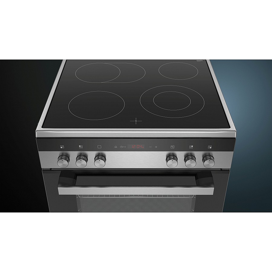 De HK9R3A250 is een vrijstaand elektrisch fornuis met een keramische kookplaat van Siemens. De kookplaat is voorzien van vier highSpeed kookzones, waarvan één variabele kookzone en één uitbreidbare braadzone.