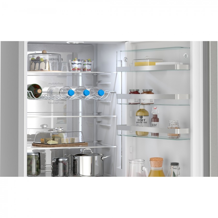 Deze Siemens KG39NAIAU vrijstaande koel-vriescombinatie biedt uitzonderlijk gemak dankzij het Total NoFrost-systeem, waardoor u nooit meer handmatig hoeft te ontdooien en condensvorming verleden tijd is. De hyperFresh technologie zorgt voor een geoptimaliseerd klimaat dat groente en fruit aanzienlijk langer vers en knapperig houdt. Met een energie-efficiëntieklasse A en een laag geluidsniveau van slechts 29 dB is het toestel zowel zuinig als opmerkelijk stil. De metalen achterwand met MultiAirflow garandeert een uniforme en gelijkmatige koeling in de gehele koelkast, zodat alle producten perfect op temperatuur blijven. Bovendien beschikt het apparaat over een praktische bottleCooler voor het moeiteloos koelen en opbergen van flessen.