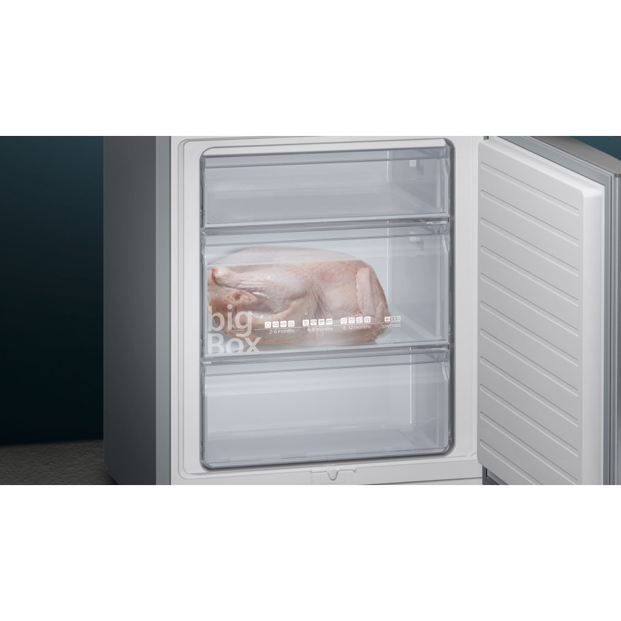 De koelruimte zit bij deze koel-vriescombinatie aan de bovenzijde en is 302 liter groot. Het vriesgedeelte aan de onderzijde beschikt over 3 transparante vriescompartimenten en heeft een inhoud van 117 liter. Zeer ruime RVS koel-/vriescombinatie met lowFrost en hyperFresh om levensmiddelen langer vers te houden.