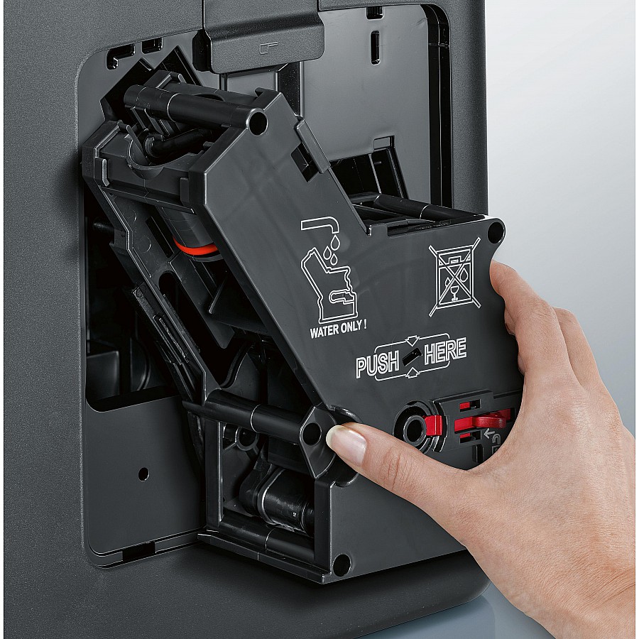 Met de individualCup Volume functie kunt u de standaardinstellingen voor ‘klein’, ‘medium’ en ‘groot’ op vijf verschillende hoeveelheden instellen naar de hoeveelheid die u wenst. Samen met het sensoFlow System, dat zorgt voor de beste temperatuur voor het maximale aroma, wordt de meest professionele koffie gerealiseerd. Met het serviceprogramma van calc’nClean wordt het schoonmaken van uw apparaat zeer gemakkelijk en optimaliseert u ook nog eens de levensduur van de Siemens TE657F03DE extraKlasse.