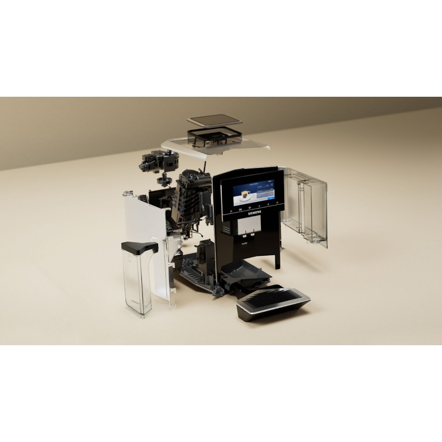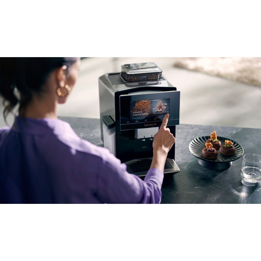 De Siemens TQ905DF9 ExtraKlasse volautomaat beschikt over een werkdruk van 19 bar uitgevoerd in RVS. Het waterreservoir heeft een inhoud van 2,3 liter en het bonenreservoir heeft een inhoud van 375 gram. Drink je graag koffie met melk? Met deze volautomaat geniet je van een heerlijke kop cappuccino. Of geniet van een heerlijke latte macchiato. De koffiemachine beschikt over een heetwaterfunctie, zodat je er ook thee mee kunt zetten.