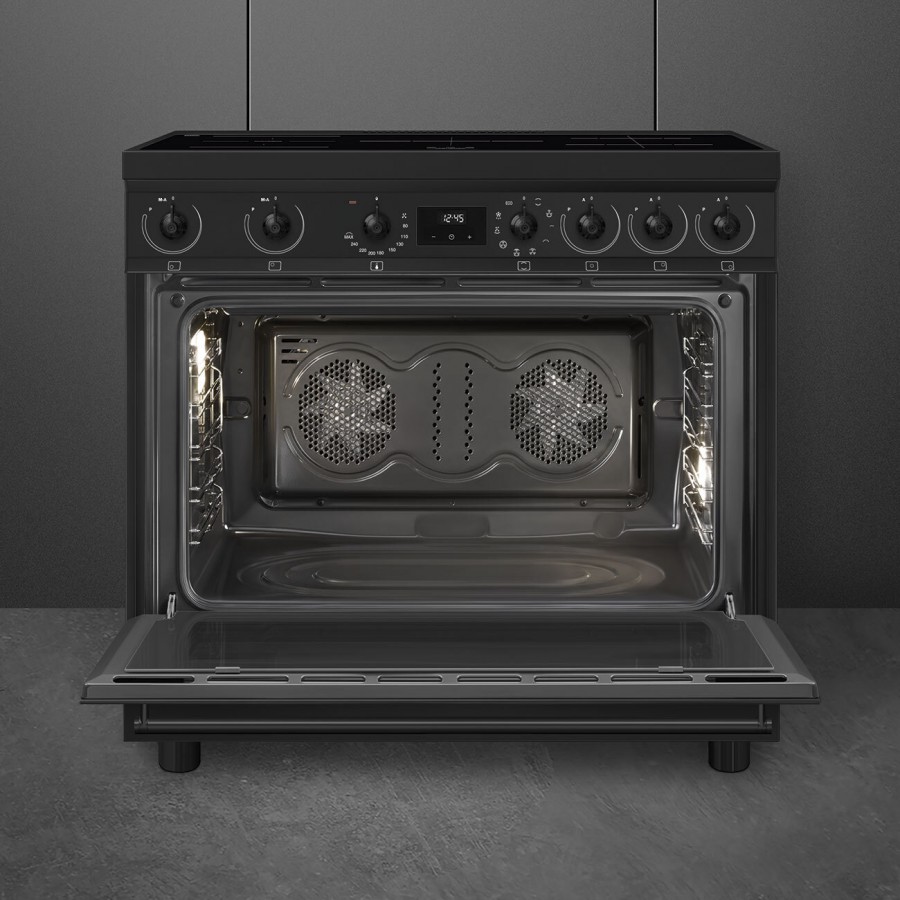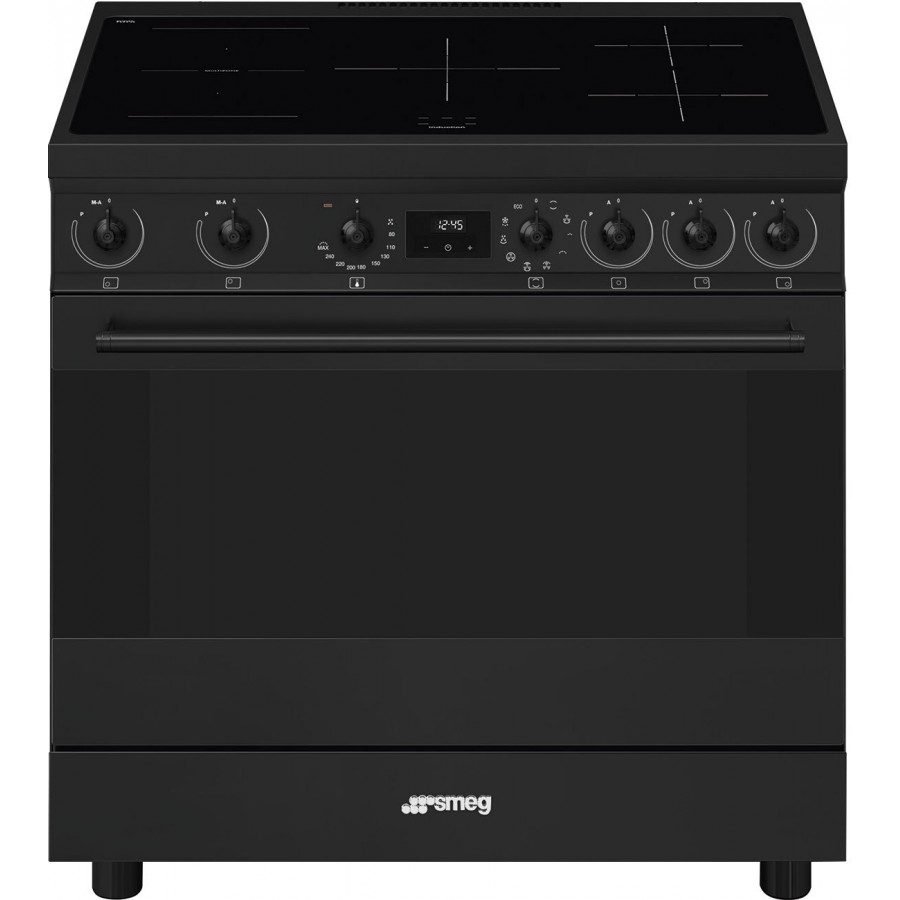 Het nieuwste Smeg C9IMN2 design fornuis, volledig uitgevoerd in mat zwart en voorzien van de kenmerkende zwarte Classici knoppen, biedt een perfecte combinatie van stijl en functionaliteit. Met vijf inductie kookzones, eenvoudig bedienbaar aan de voorzijde, en een ruime oven met een netto inhoud van 115 liter en een energieklasse A label, is dit fornuis een aanwinst voor elke keuken.