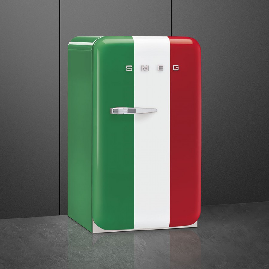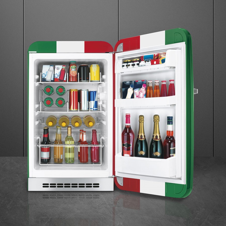 De Smeg FAB10HRDIT5 is een 96 cm. hoge retro jaren 50 koelkast uitgevoerd met in de drie kleuren van de Italiaanse vlag en voorzien van een rechtsdraaiende deur. Deze fraaie Happy Bar koelkast beschikt over de kenmerkende afgeronde deur en bijpassende greep.