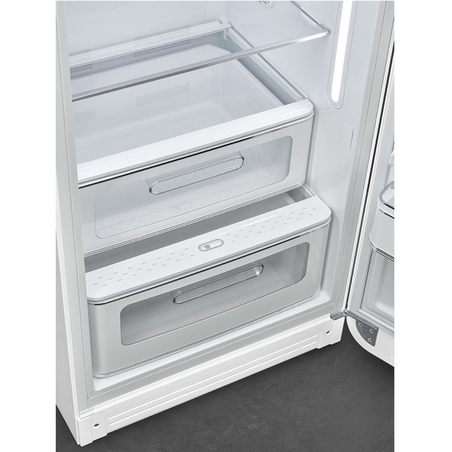 Het interieur van de Smeg FAB28RWH6 is voorzien van hoogwaardig veiligheidsglas en chromen afwerkstrips, wat zorgt voor een stijlvolle en duurzame uitstraling. De glasplateaus zijn verstelbaar, zodat u zelf de indeling kunt bepalen. De deurvakken zijn verbeterd met verstelbare chromen spijlen voor extra stabiliteit en kunnen desgewenst worden verwijderd voor een grondige reiniging of andere indeling.
