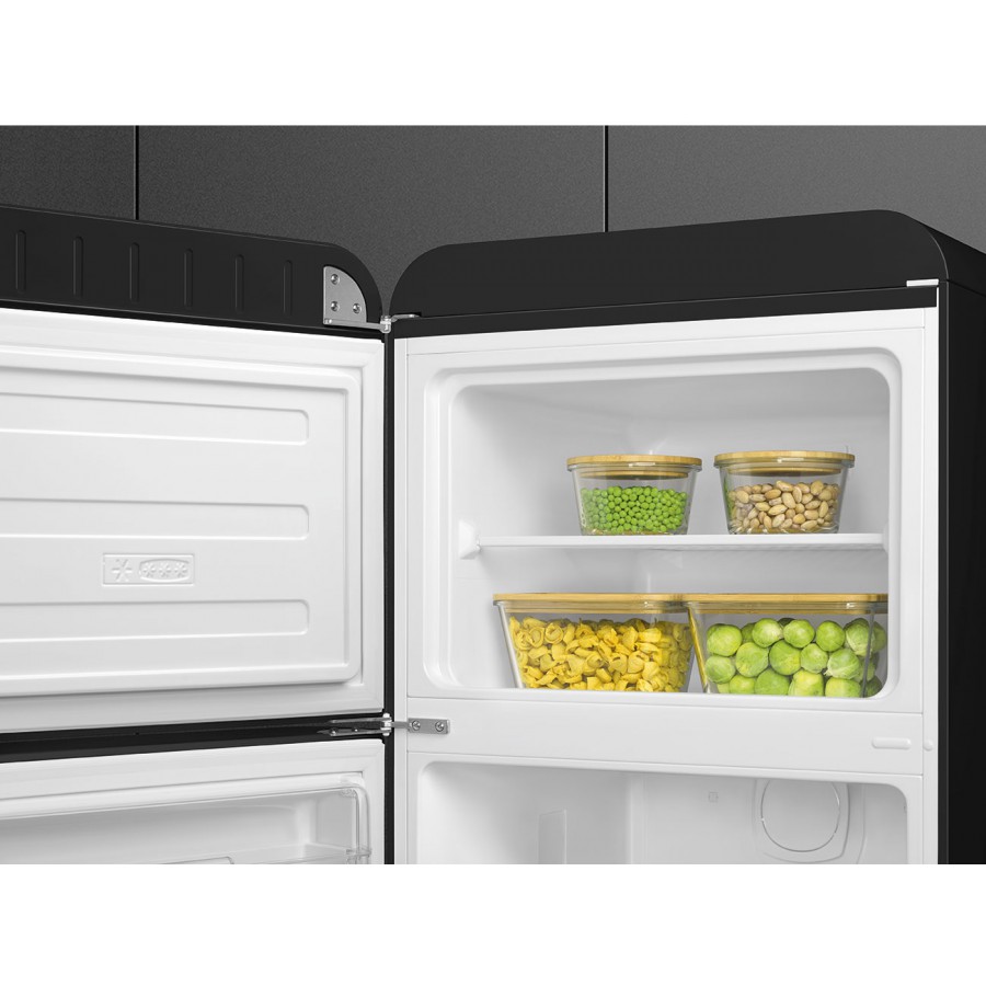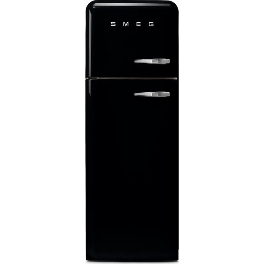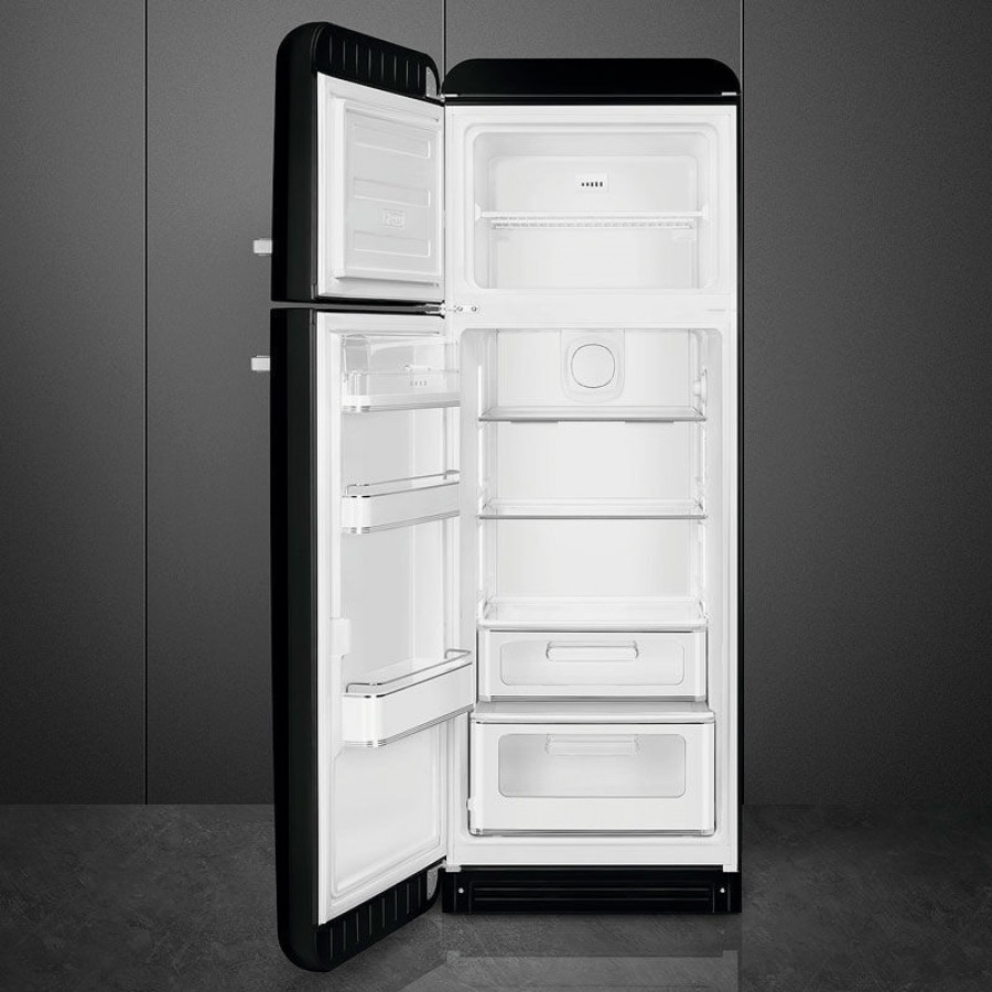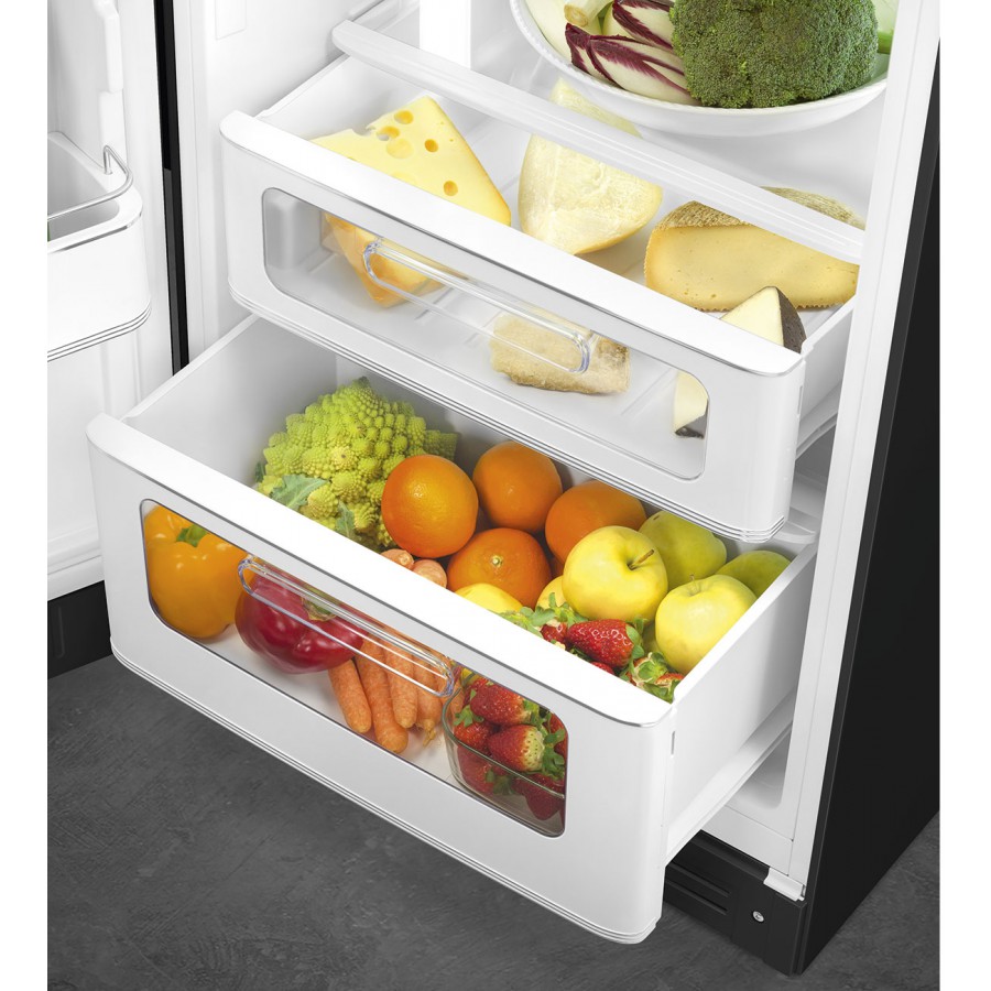 De Smeg FAB30LBL5 is een linksdraaiende design koelkast van 172 cm. hoog uitgevoerd met een ruim koelgedeelte onder (inhoud van 193 liter) en een apart vriesgedeelte boven (inhoud 72 liter). Deze koelkast heeft een zuinig energieklasse D label en beschikt over een zeer laag geluidsniveau van 31 dB(A).
