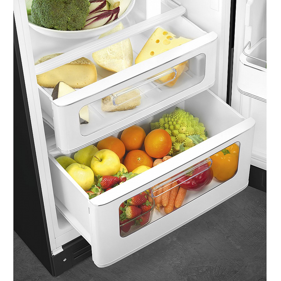 De Smeg FAB30RBL5 is een rechtssdraaiende design koelkast van 172 cm. hoog uitgevoerd met een ruim koelgedeelte onder (inhoud van 193 liter) en een apart vriesgedeelte boven (inhoud 72 liter). Deze koelkast heeft een zuinig energieklasse D label en beschikt over een zeer laag geluidsniveau van 31 dB(A).
