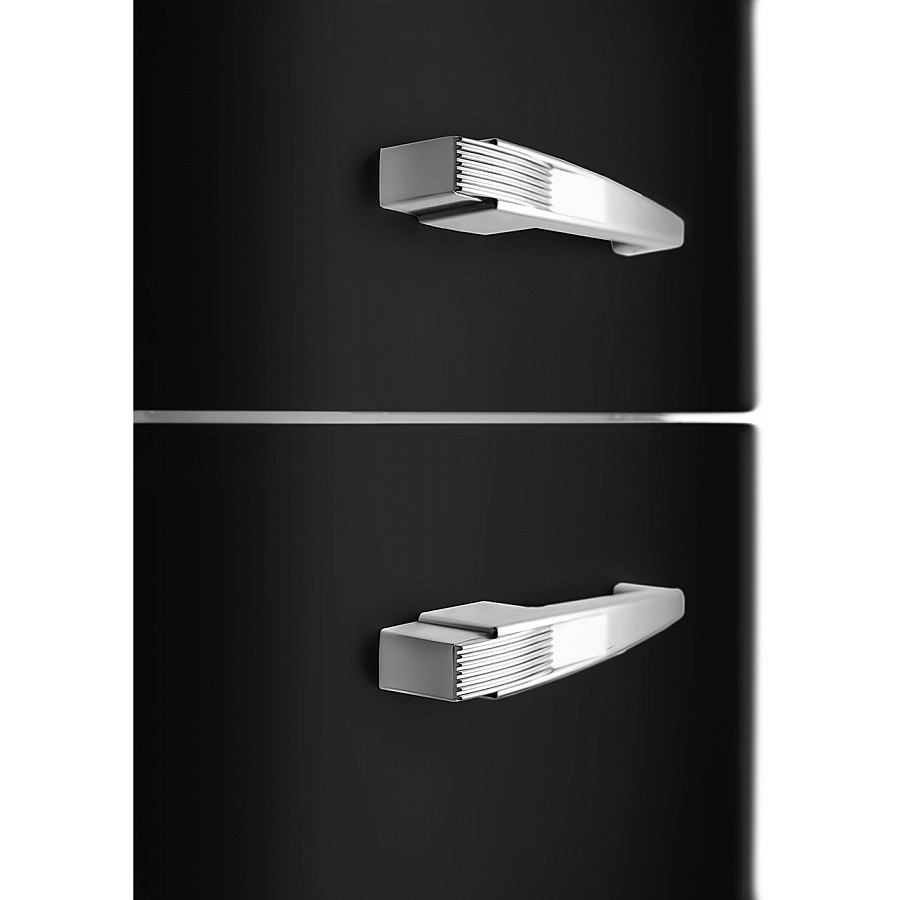 De koelkast is uitgevoerd in het kenmerkende retro jaren 50 stijl van Smeg welke terugkomt in de afgeronde hoeken, de bijpassende chromen greep en de letters S M E G op de voorzijde van de vriezer.