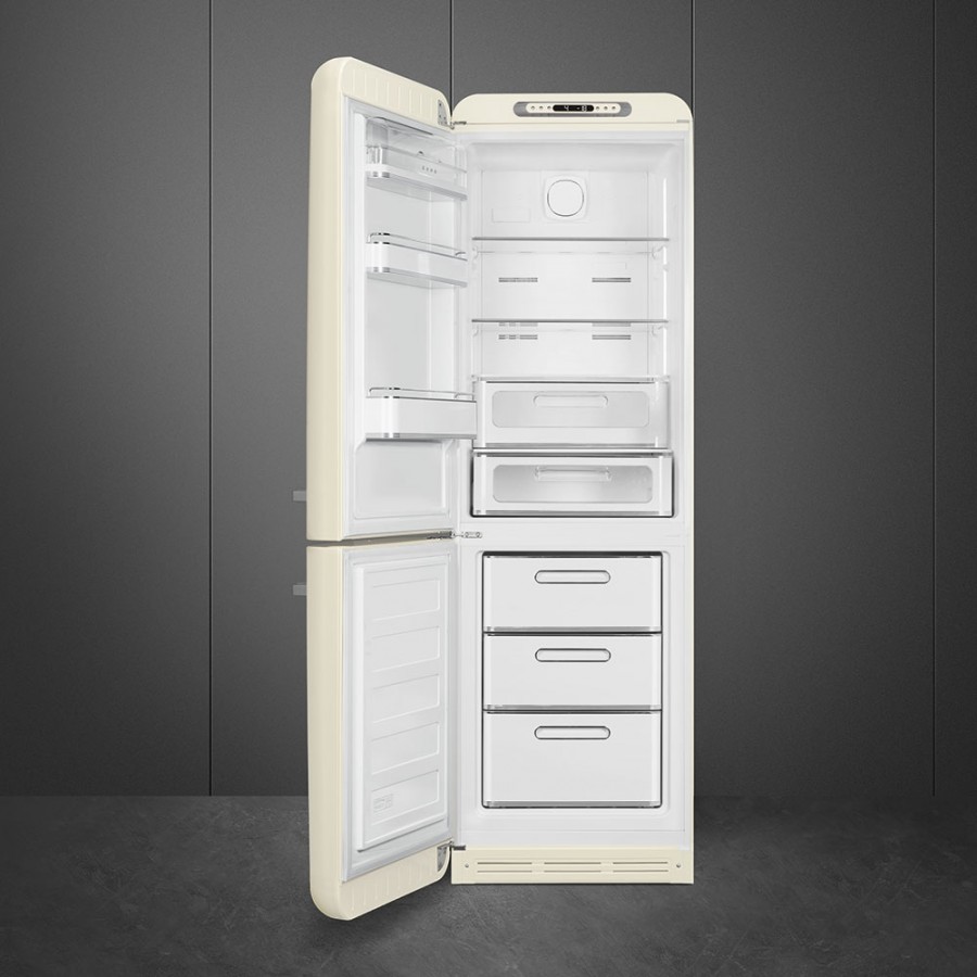 De Smeg FAB32LCR5 is een linksdraaiende koel/vriescombinatie uitgevoerd in de kleur crème en voorzien van het kenmerkende retro jaren'50 design.