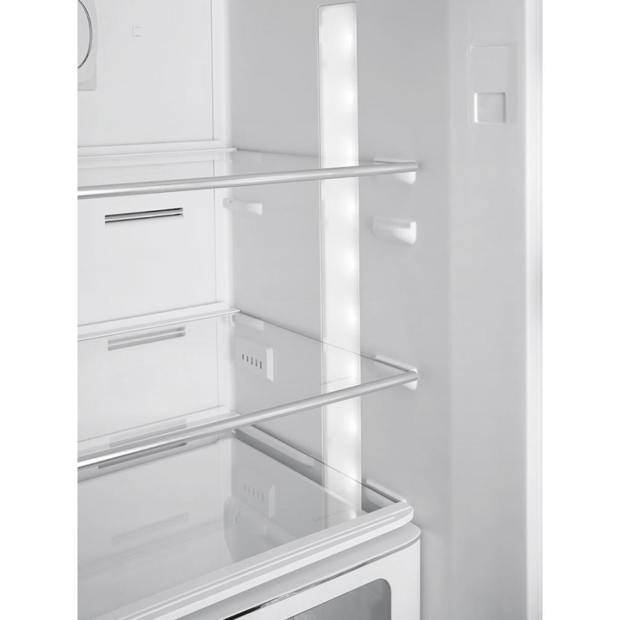 De Smeg FAB32RBL6 straalt vintage charme uit met afgeronde hoeken, verchroomde handgrepen en een diepzwarte afwerking. Dit design wordt gecombineerd met praktische moderne features zoals hoogteverstelbare plateaus en groentelades met instelbare luchtvochtigheid. De rechtsdraaiende deur voegt extra karakter toe aan deze stijlvolle keukenpartner.